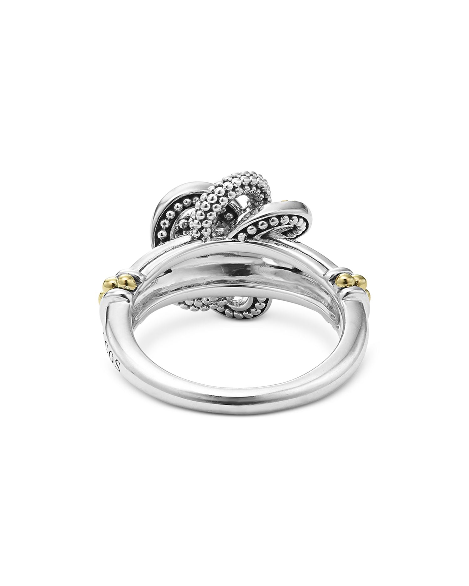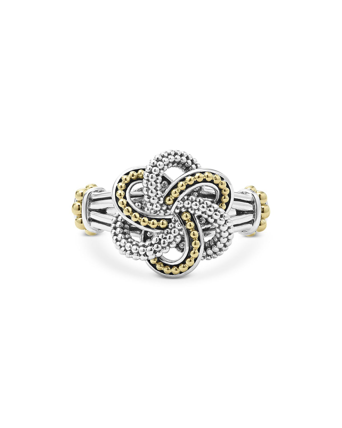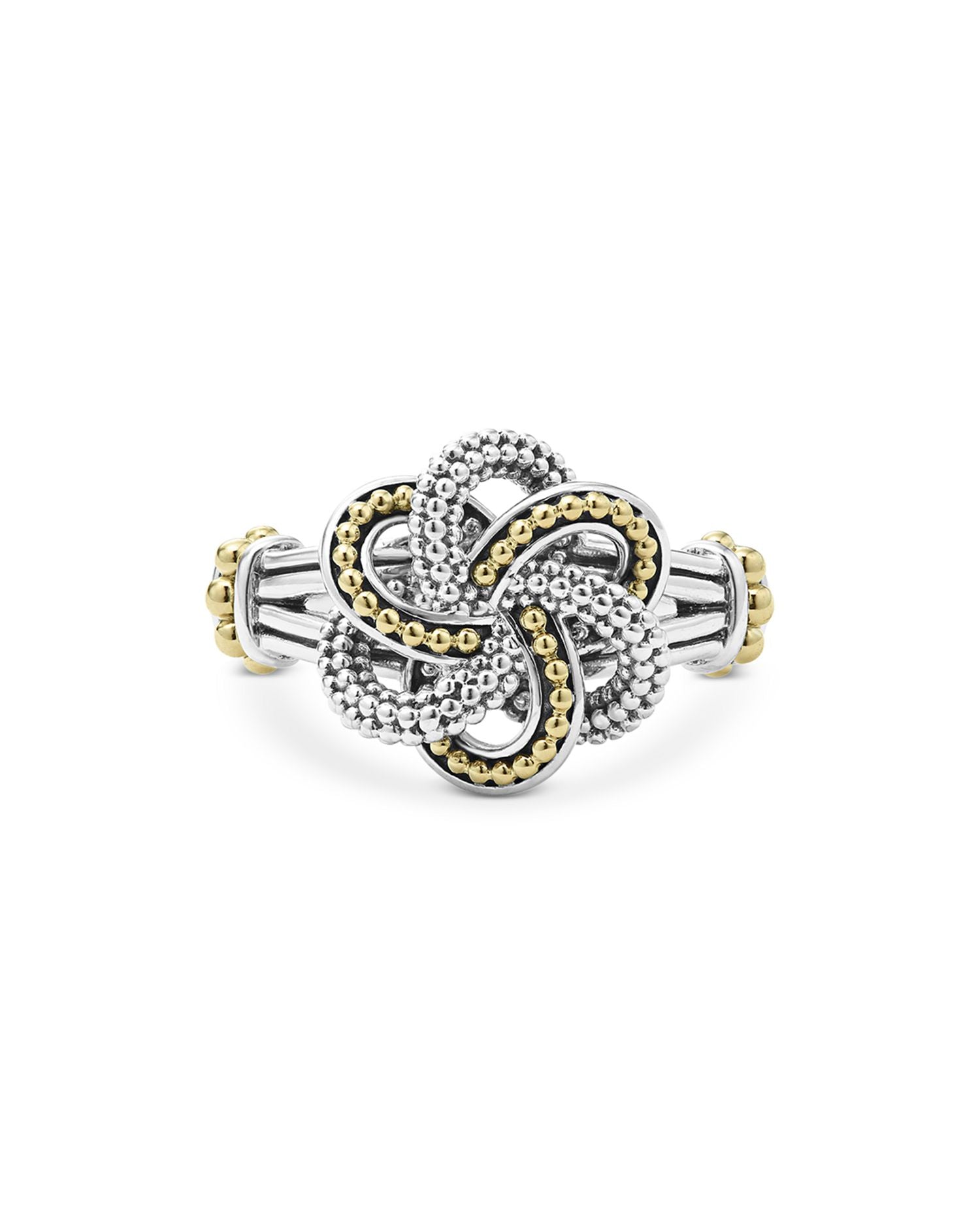 This Sterling Silver & 18K Yellow Gold Love Knot Ring by LAGOS is a romantic piece from the Love Knot collection. Designed with intertwined bands of silver and gold Caviar beading, it symbolizes unity and everlasting love, making it a meaningful addition to any jewelry collection.