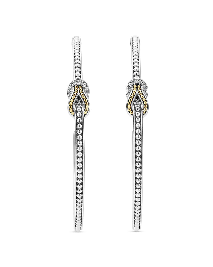 These 18K Yellow Gold & Sterling Silver Newport Diamond Knot Large Hoop Earrings by LAGOS are striking two-tone earrings from the Newport collection. Featuring diamond knot accents and signature Caviar beading, these hoops offer a bold yet elegant statement for any occasion.