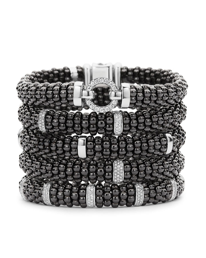 This Black Caviar Ceramic Bracelet with Sterling Silver and Diamonds by LAGOS combines bold black ceramic beads with a pavé diamond circle connector and sterling silver accents. A dramatic and luxurious design that adds elegance and sparkle to any outfit.