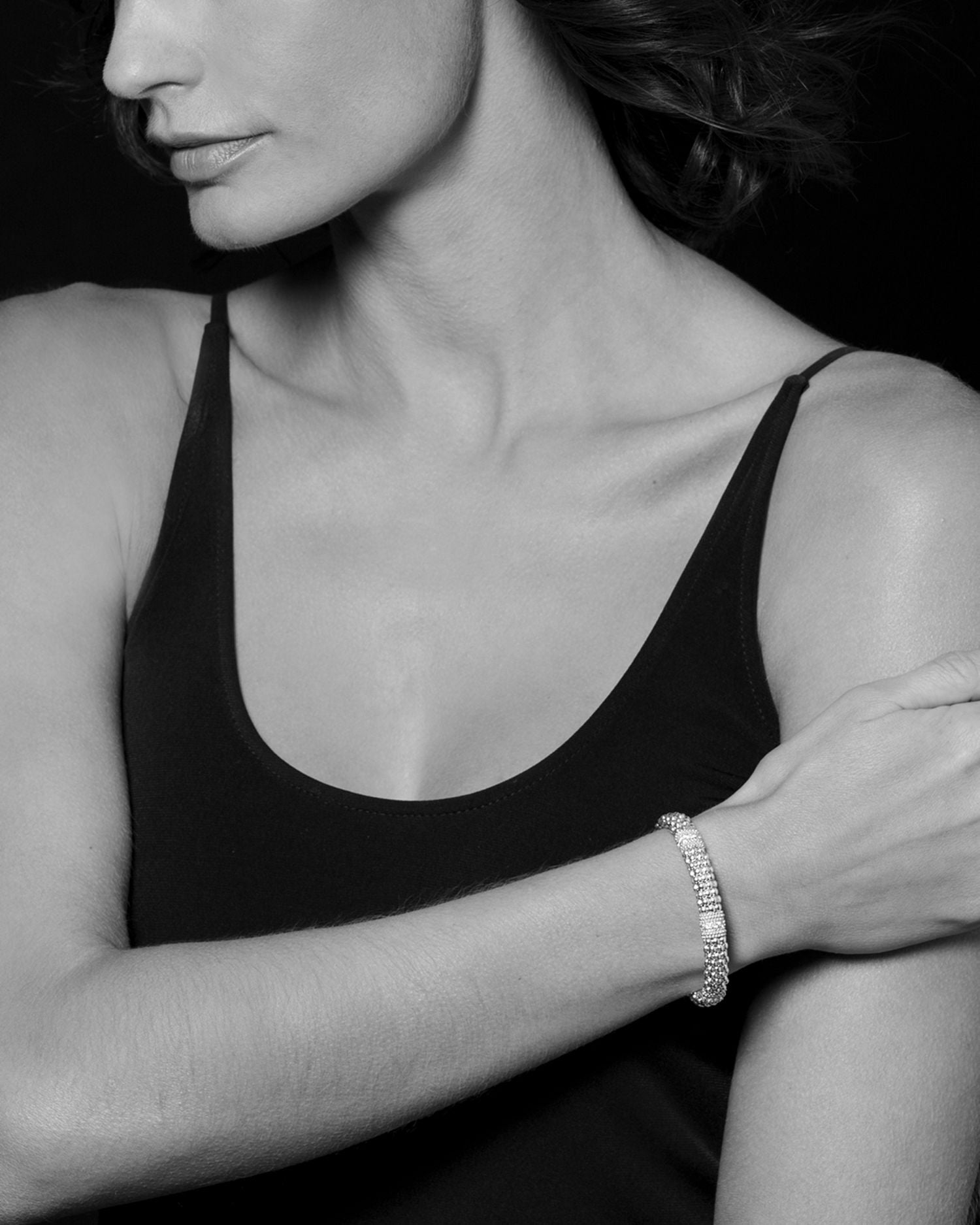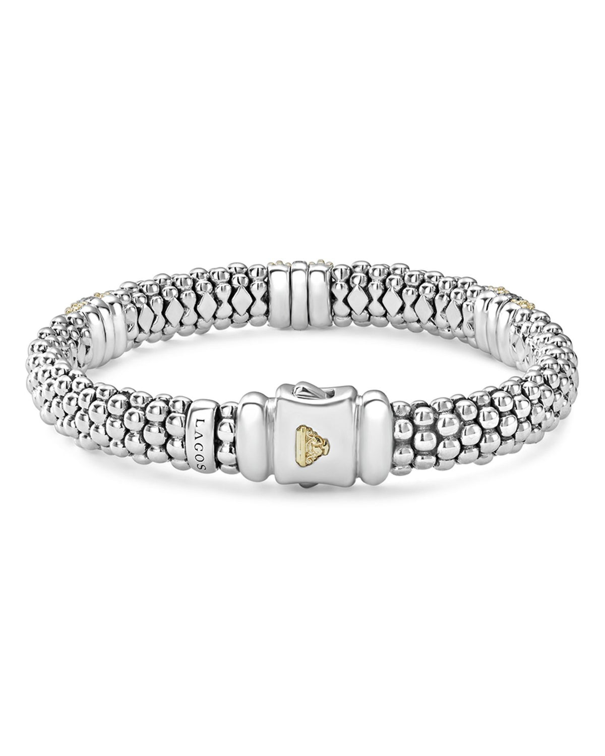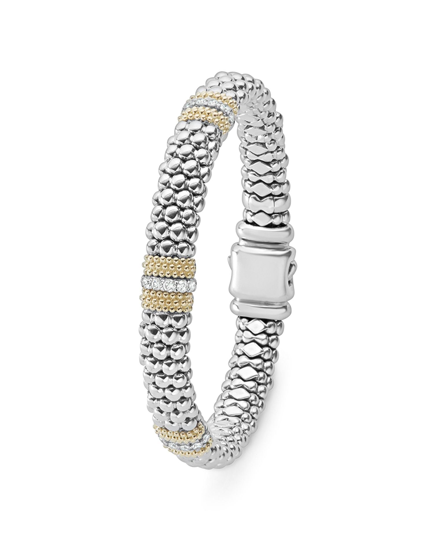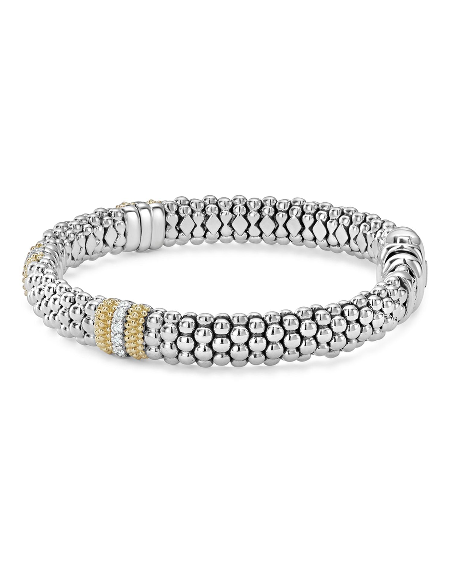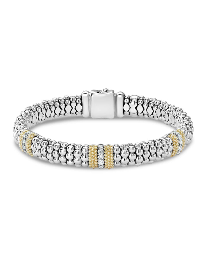 This 18K Gold & Sterling Silver Diamond Lux Three Station Bracelet by LAGOS showcases three diamond stations framed by 18K gold and sterling silver Caviar beading. Its sophisticated design makes it an exquisite addition to your jewelry collection, perfect for special occasions or everyday luxury.