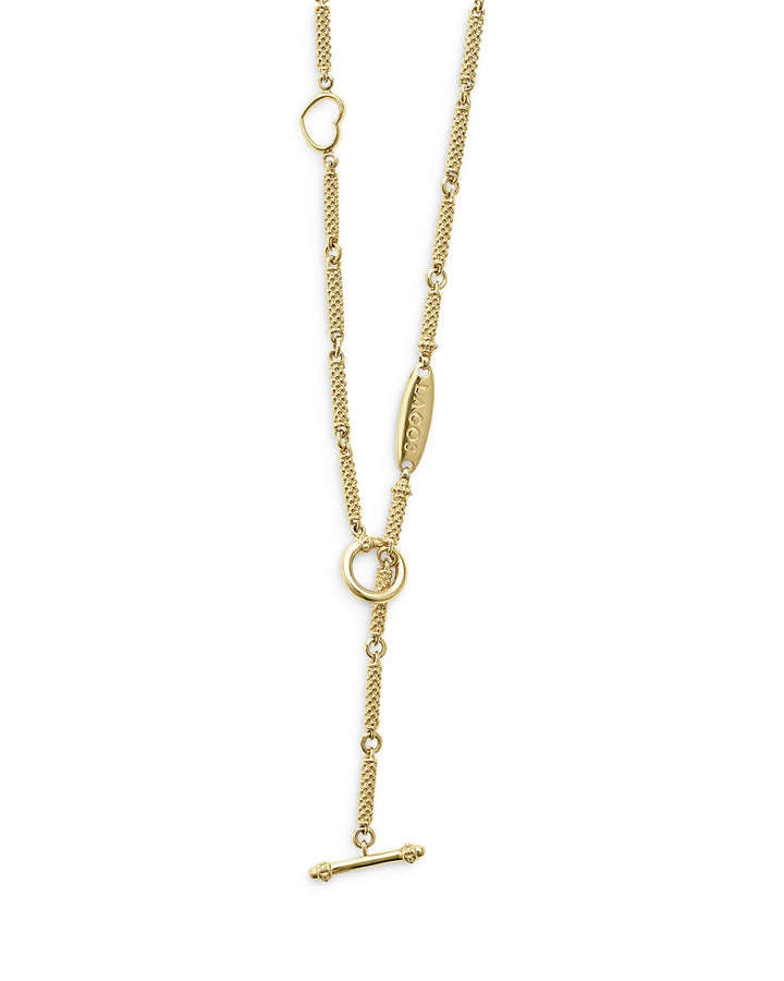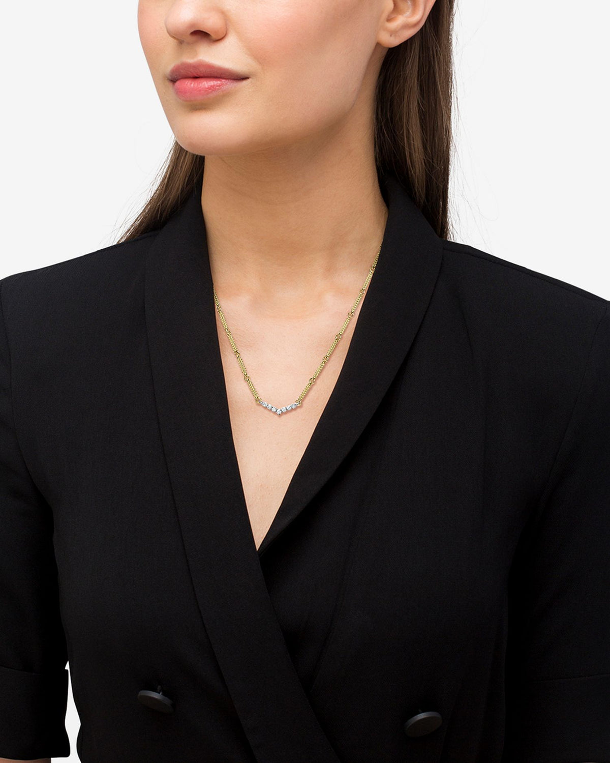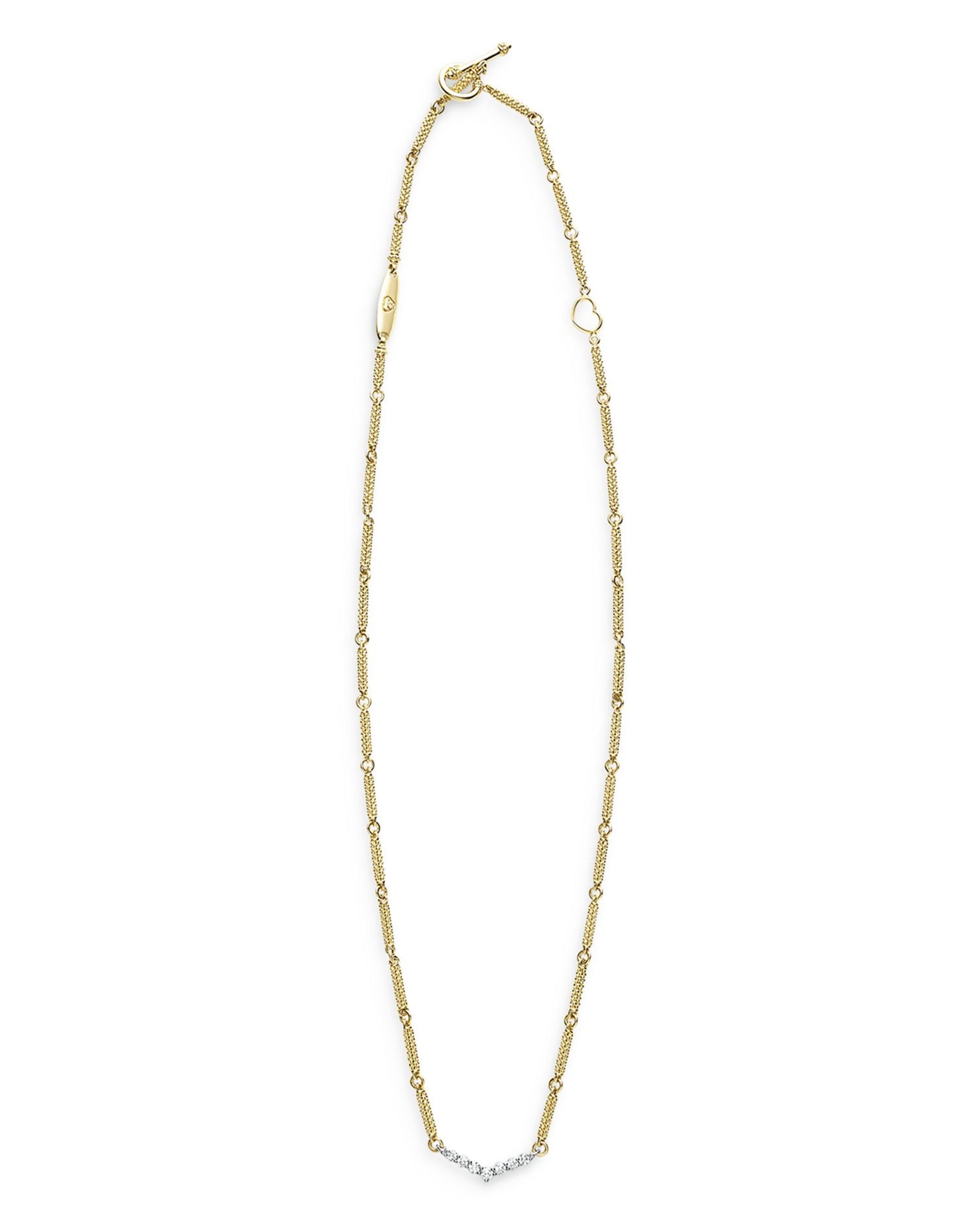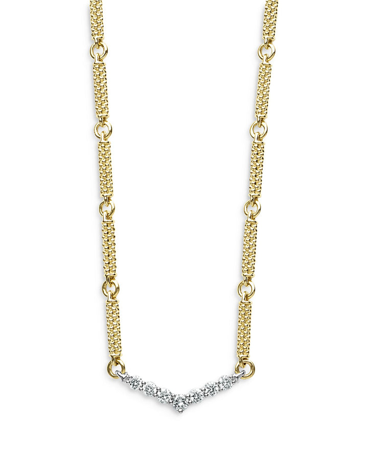 This 18K White & Yellow Gold Signature Caviar Diamond Chevron Bead Link Statement Necklace by LAGOS is an exquisite piece from the Signature Caviar collection. The chevron diamond motif adds a shimmering focal point to the classic Caviar bead link design, creating a statement of refined luxury.
