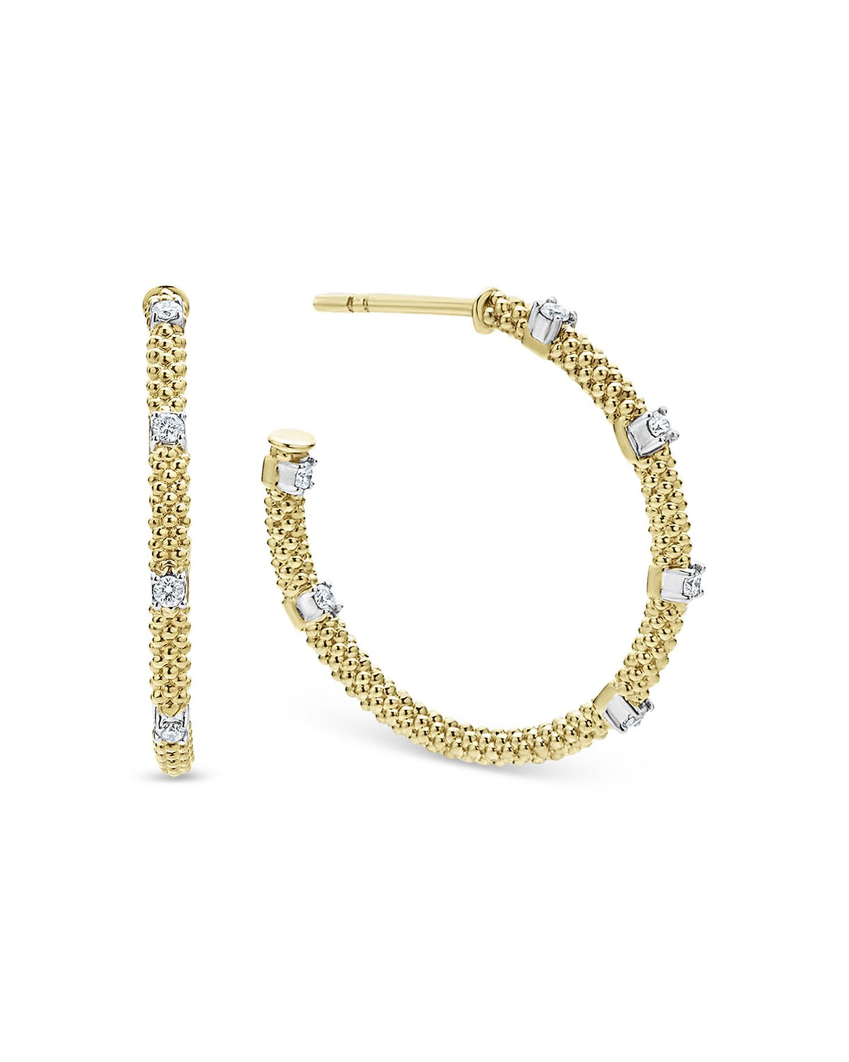 These 18K White & Yellow Gold Caviar Diamond Hoop Earrings by LAGOS are an elegant design from the Caviar collection. The two-tone gold finish is complemented by diamond stations, creating a timeless and versatile addition to any jewelry collection.