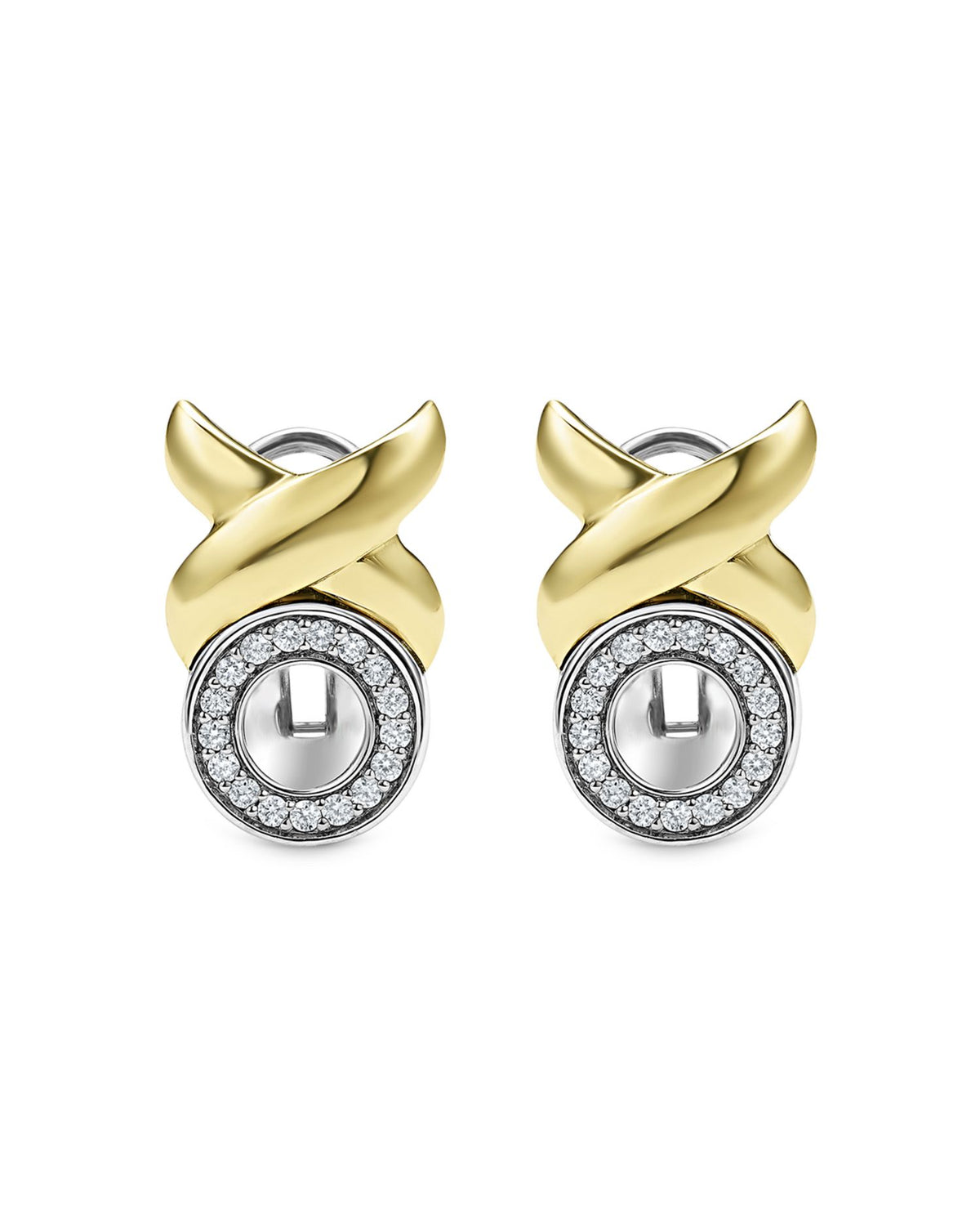 These 18K Yellow Gold & Sterling Silver Embrace Diamond XO Omega Earrings by LAGOS are a striking design from the Embrace collection. Featuring sparkling diamond circles framed by 18K gold Xs, these two-tone earrings offer dramatic flair with timeless sophistication.