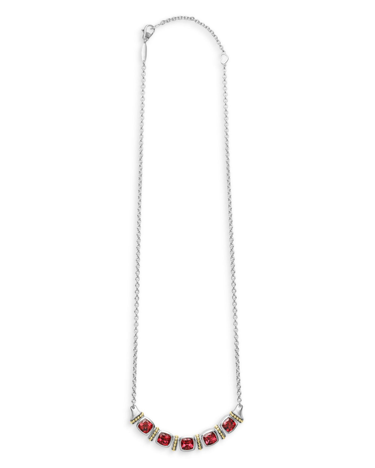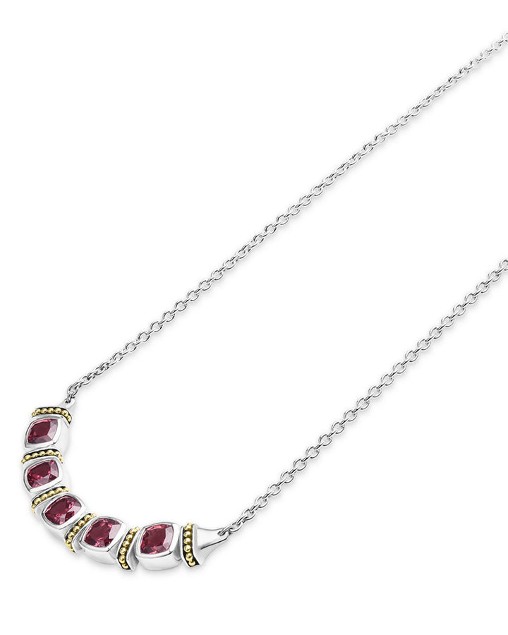 This 18K Yellow Gold & Sterling Silver Rittenhouse Rhodolite Garnet Multi Stone Statement Necklace by LAGOS is a vibrant piece from the Rittenhouse collection. Alternating richly-hued rhodolite garnets and golden beaded rondelles create a striking and colorful design, perfect for making a bold statement.