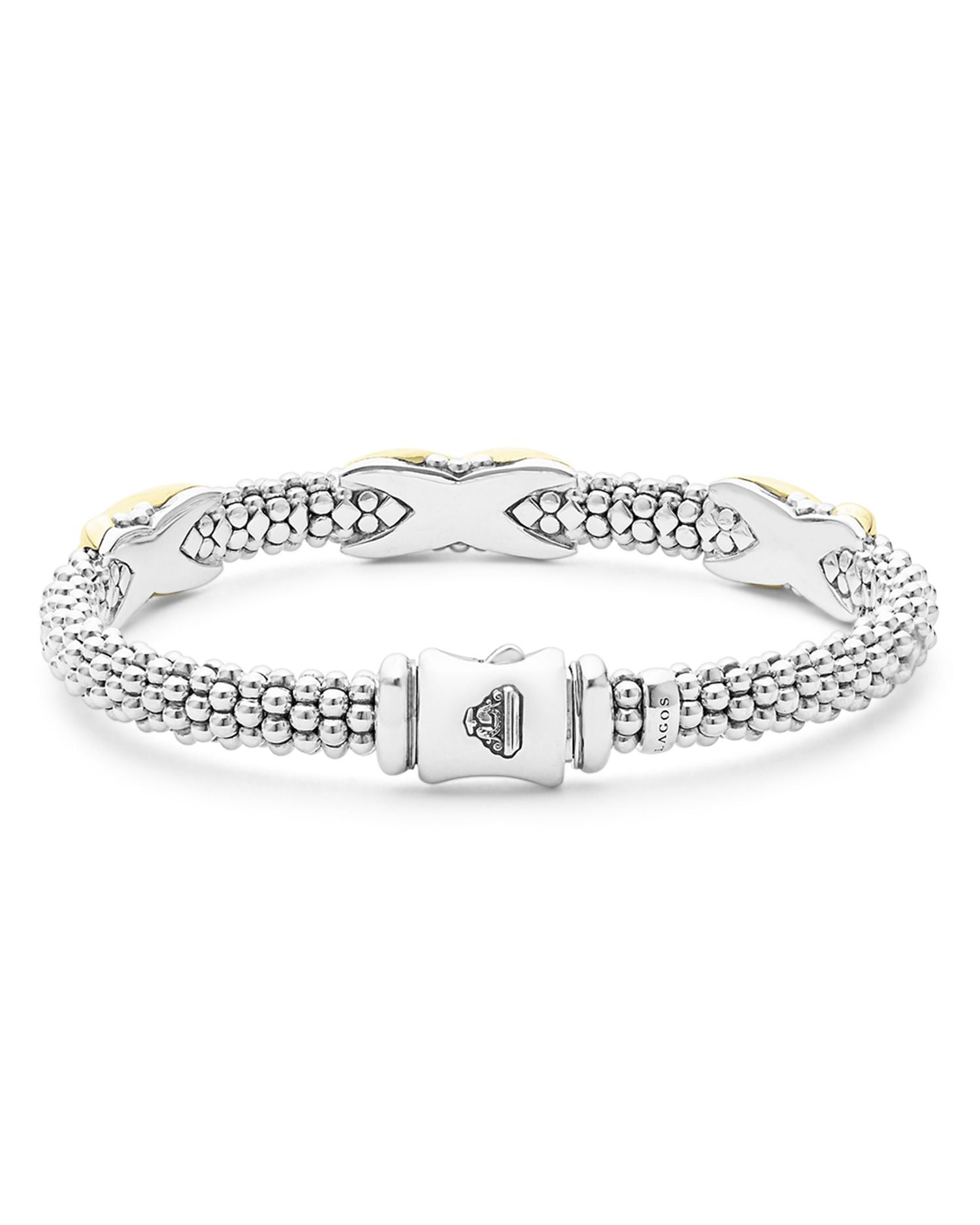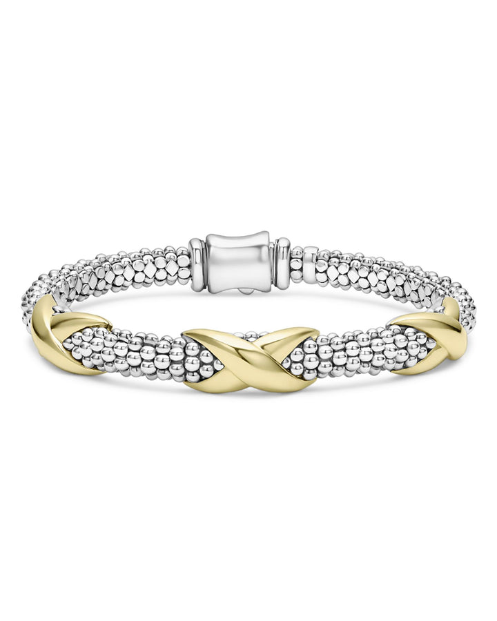This 18K Yellow Gold & Sterling Silver Embrace Triple X Caviar Bead Link Bracelet by LAGOS is a refined piece from the Embrace collection. Featuring three polished gold Xs contrasted against sterling silver Caviar beading, this bracelet offers a sleek and timeless design, ideal for any occasion.