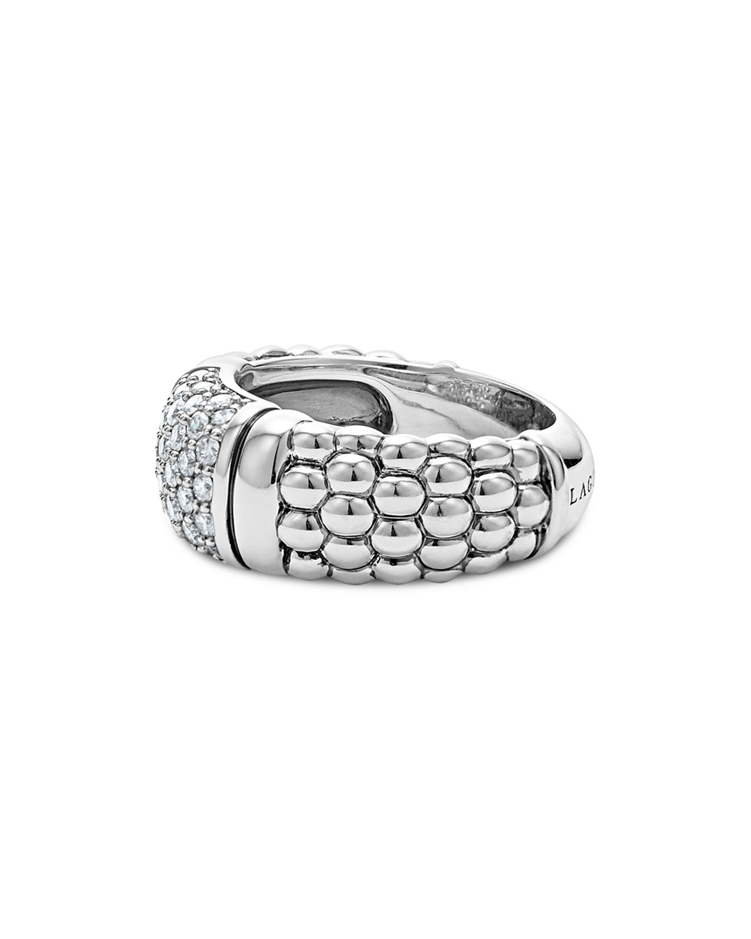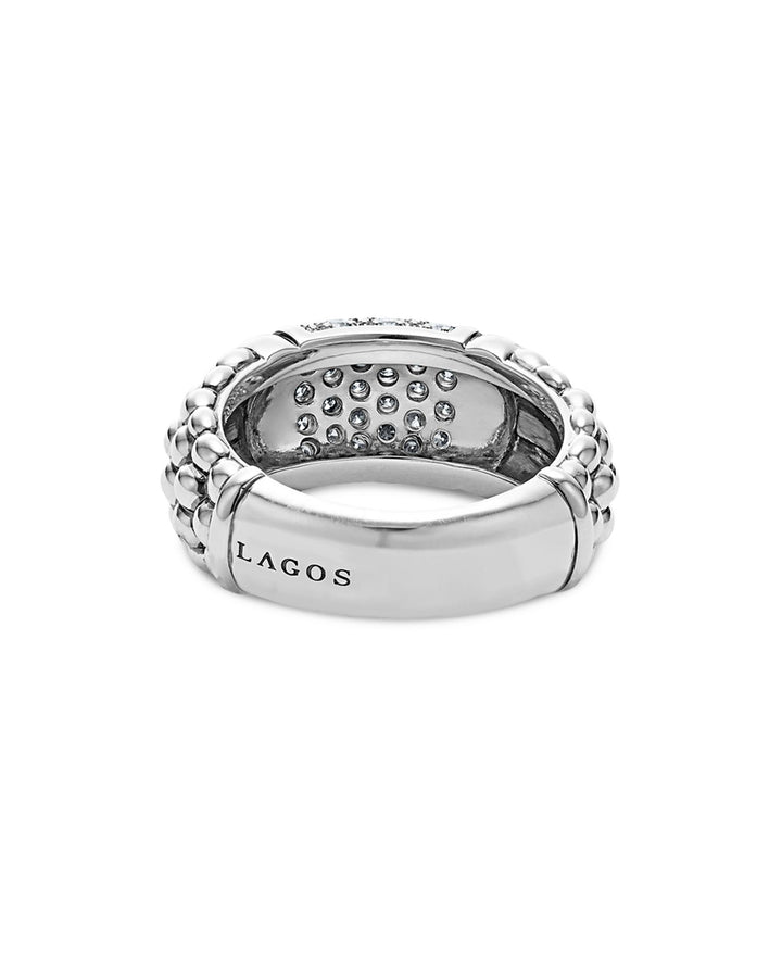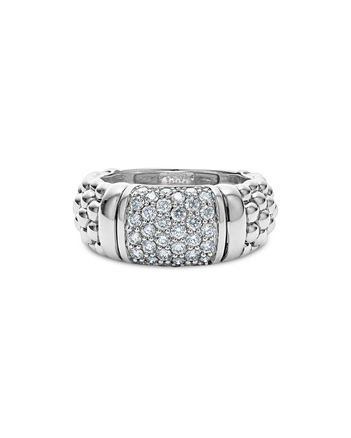 This Sterling Silver Pavé Diamond Caviar Ring by LAGOS is a dazzling piece from the Signature Caviar collection. Featuring radiant pavé diamonds set in sterling silver Caviar beading, this ring combines sparkle and texture for a luxurious and timeless look.