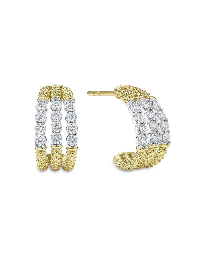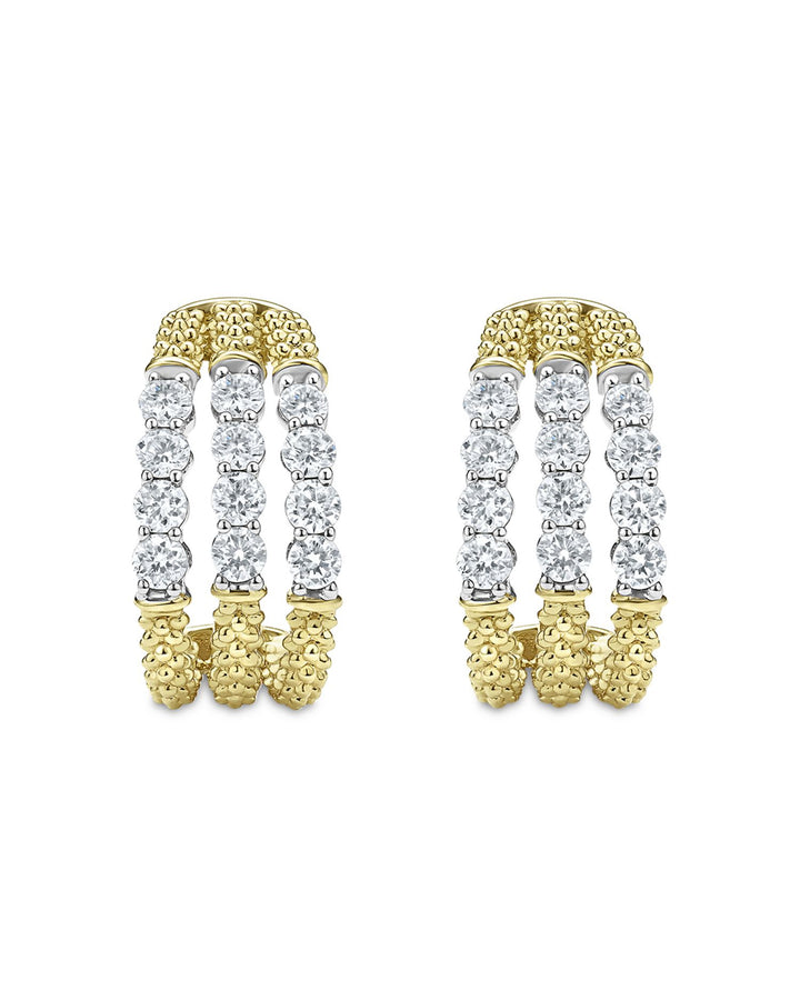 These 18K White & Yellow Gold Signature Caviar Diamond Triple Row Hoop Earrings by LAGOS are a luxurious addition to the Signature Caviar collection. The triple-row design, set with sparkling diamonds, radiates elegance and versatility, making these hoops a standout choice for any occasion.