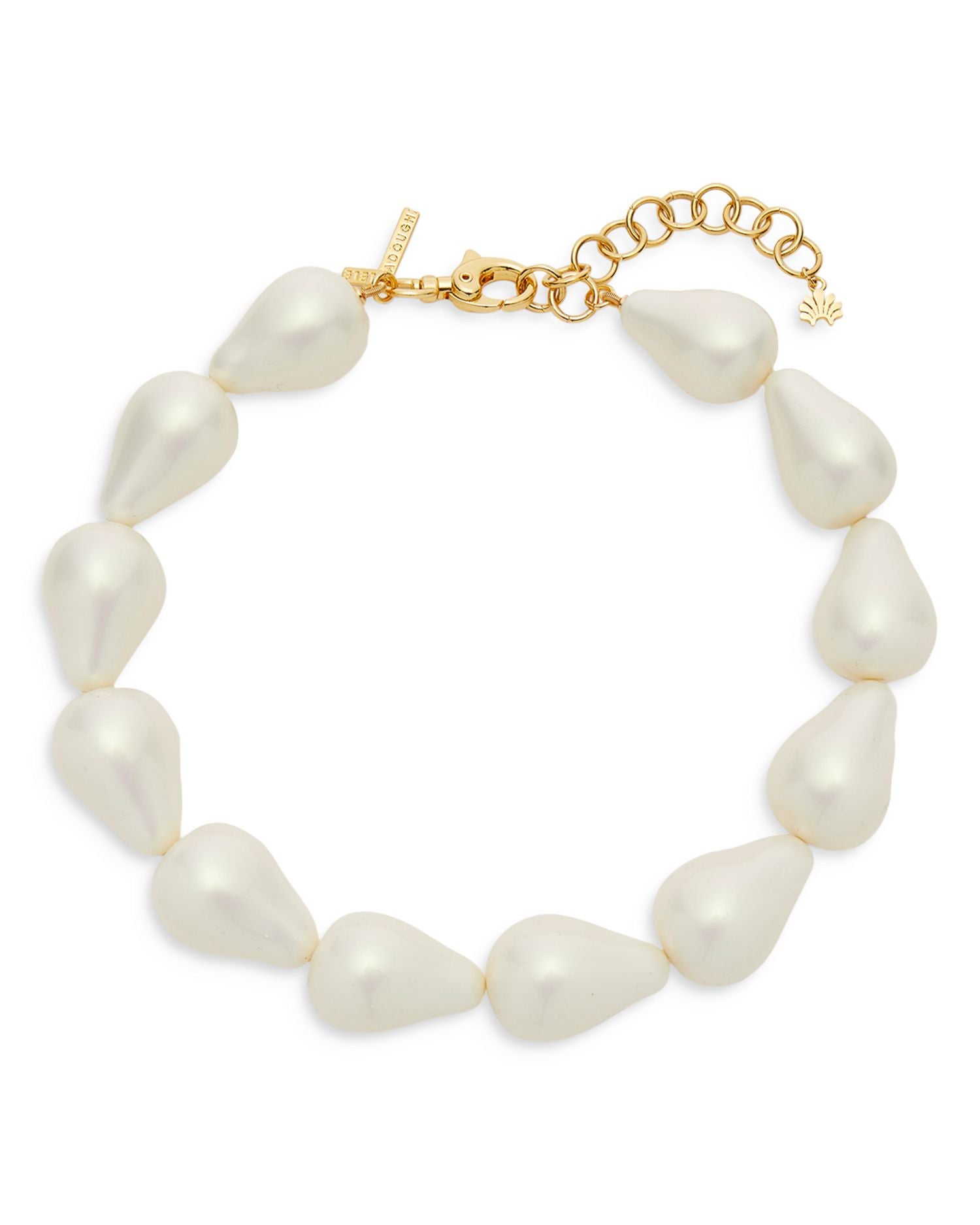 This Wilma Imitation Pearl Necklace in 14K Gold Plated by Lele Sadoughi is a refined and modern take on classic pearls. Featuring imitation pear-shaped glass pearls and a gold-plated finish, this necklace is perfect for adding sophistication to any neckline.