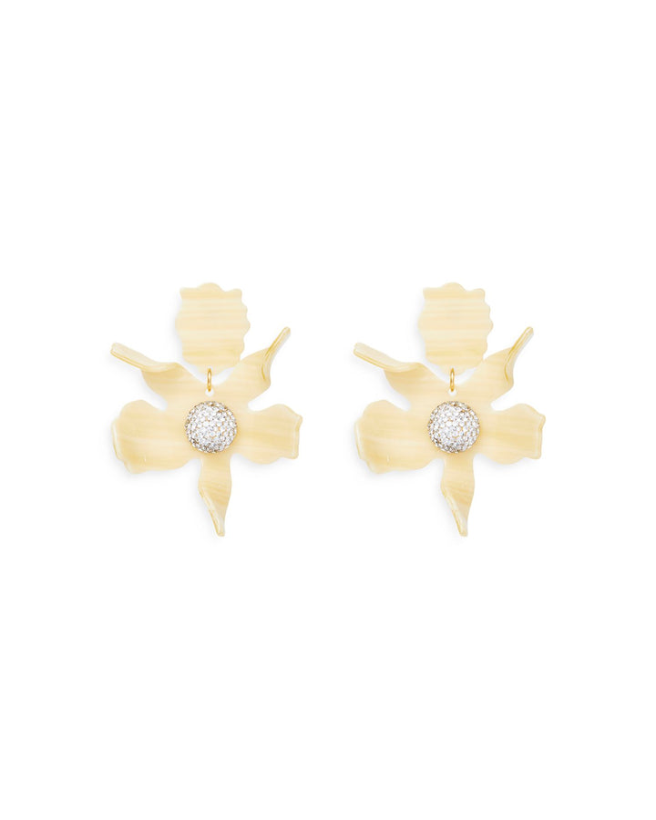These Lily Brass Earrings by Lele Sadoughi are an artistic and bold statement. Featuring hand-swirled acetate petals on brass settings, these earrings create a unique floral-inspired look with dramatic appeal.