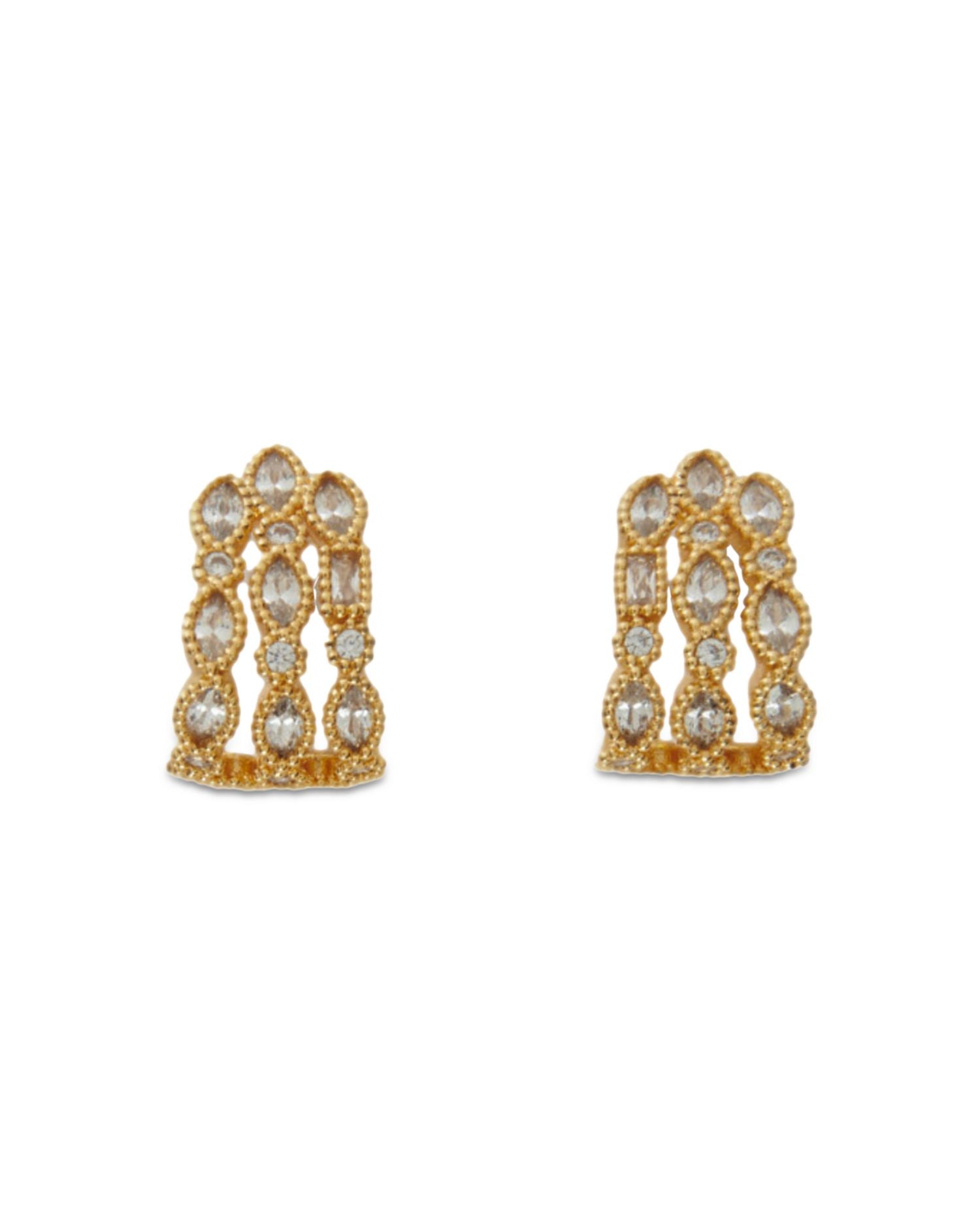 These Rhinestone Triple Row Curved Earrings by Maje are a glamorous and sophisticated design. Featuring three rows of rhinestones on a curved gold-plated setting, these earrings add brilliance and elegance to any occasion.