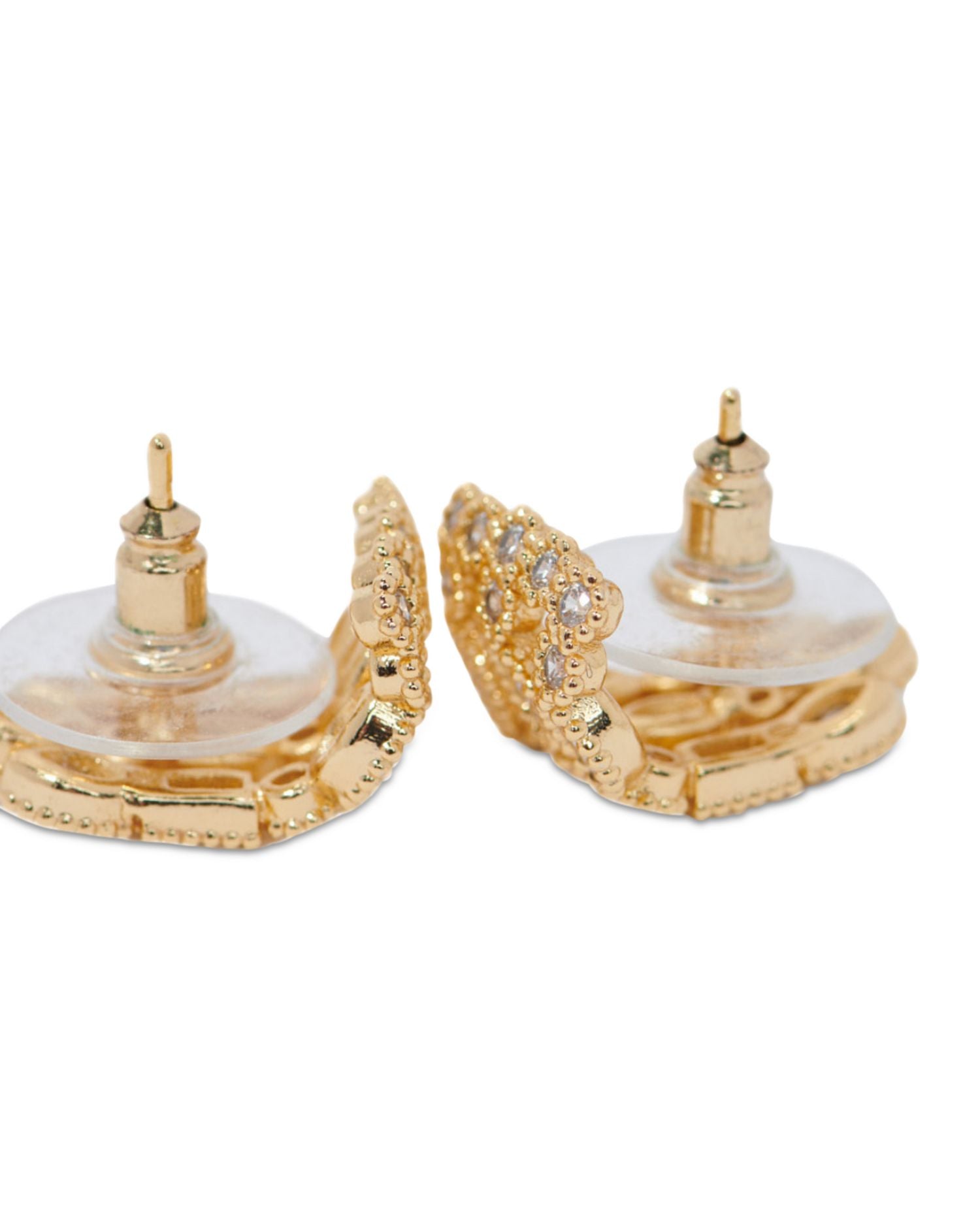 Crafted in gold-plated brass with rhinestones. Secured with post back closures.