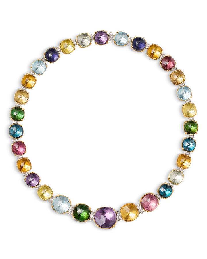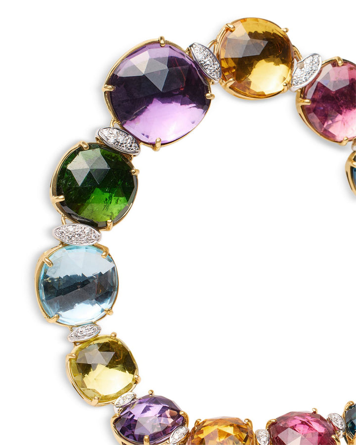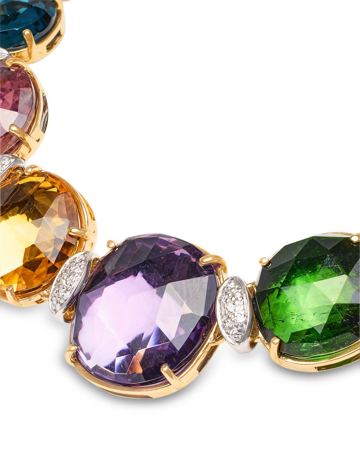 Handcrafted in 18K yellow gold with amethyst, green amethyst, iolite, lemon citrine, champagne quartz, yellow quartz, topaz, pink tourmaline, green tourmaline, and diamonds totaling 0.66 carats (F-G/VS). Length: 17.75'. Made in Italy.