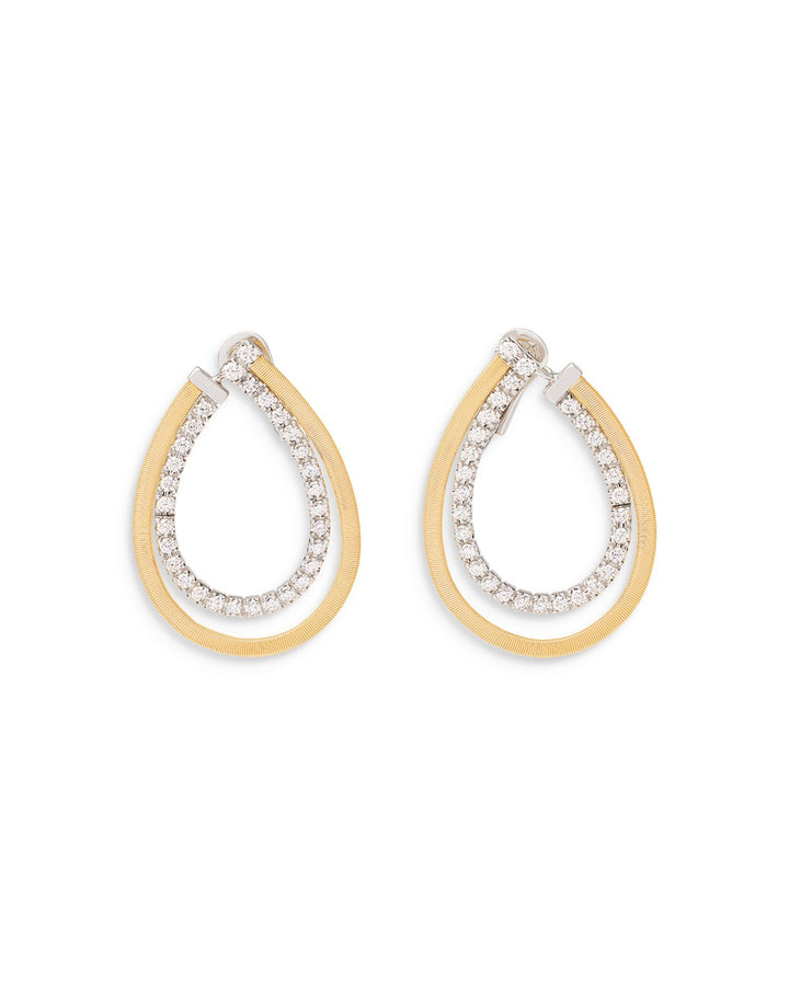 These 18K Yellow & White Gold Masai Diamond Pear Double Spiral Hoop Earrings by Marco Bicego are a bold and glamorous design from the Masai collection. Featuring a double spiral structure adorned with pear-shaped diamonds, these hoops bring dynamic elegance to your accessory collection.