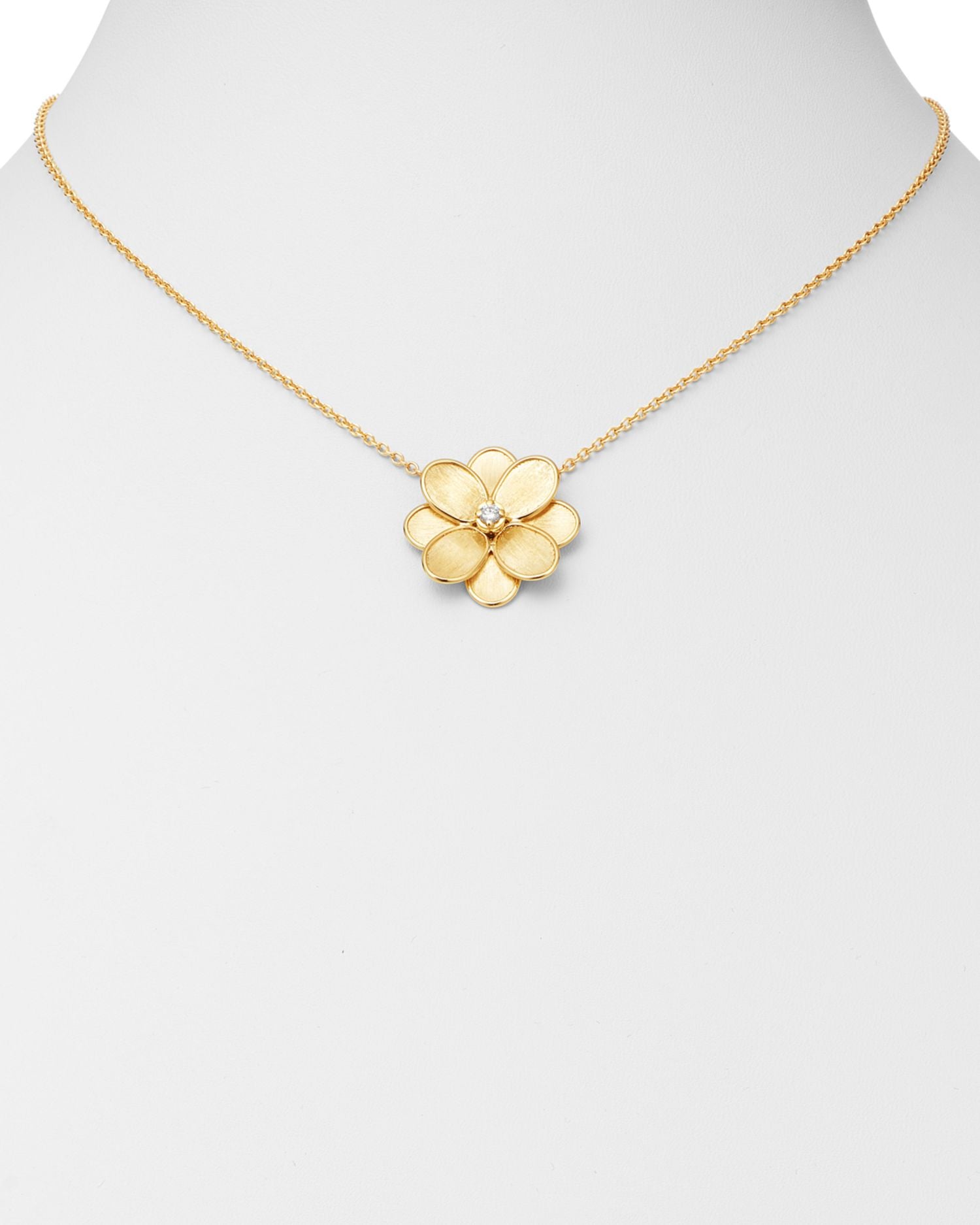 This 18K Yellow Gold Petali Pendant Necklace by Marco Bicego is a delicate and romantic design from the Petali collection. Featuring a flower-shaped pendant with a sparkling diamond center, this necklace is a beautiful symbol of nature-inspired elegance.