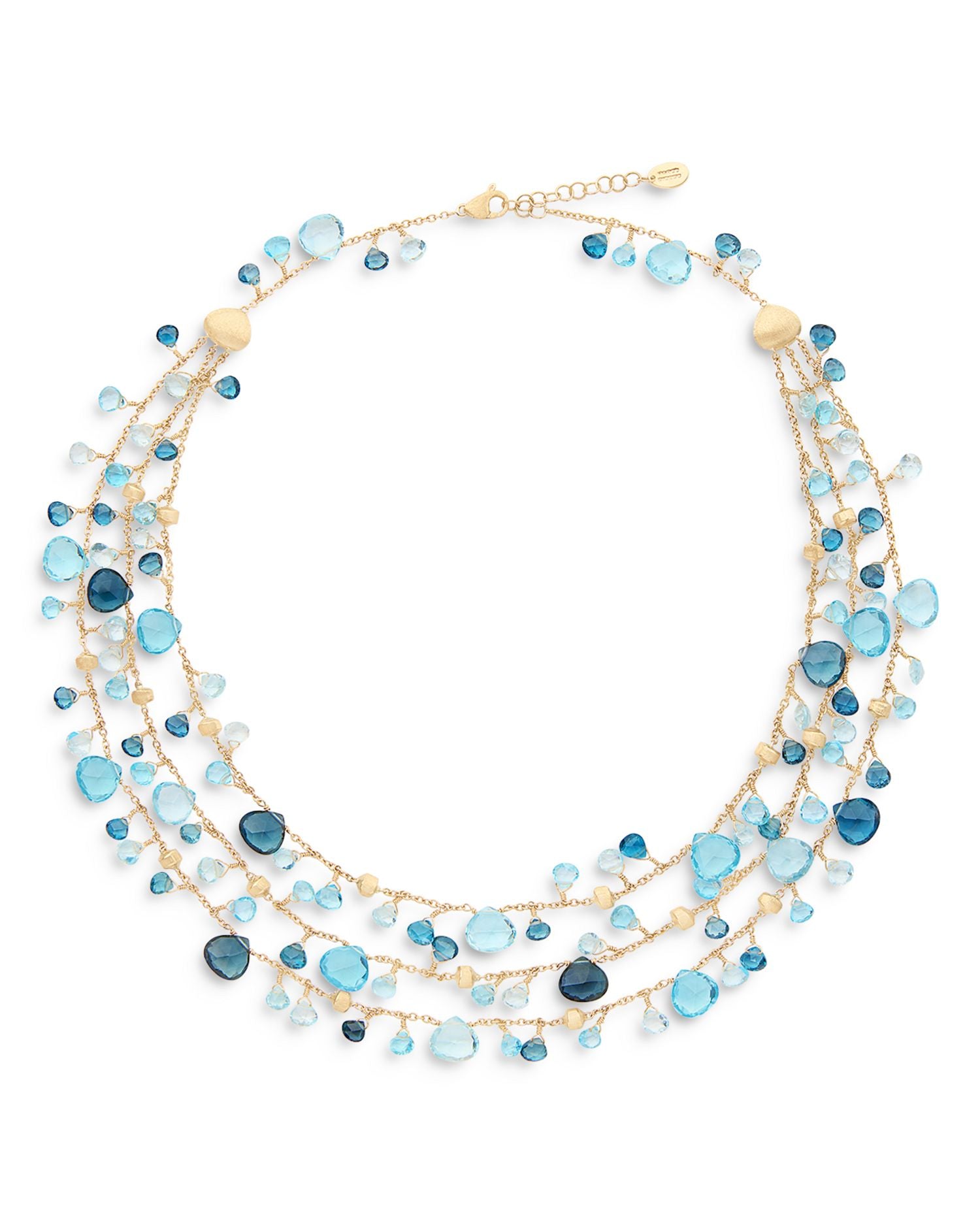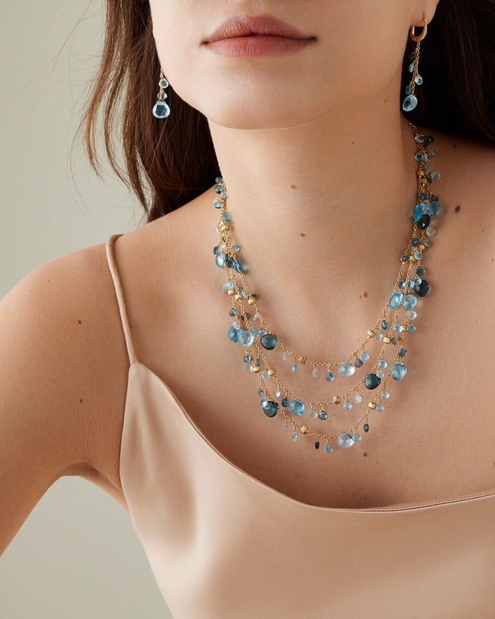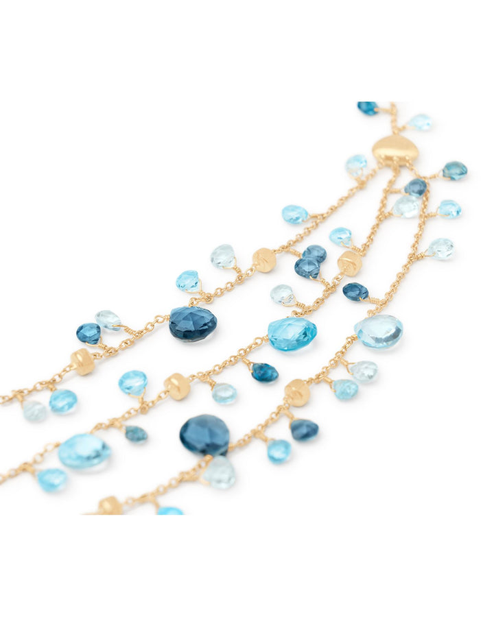 This 18K Yellow Gold Paradise Topaz London Blue & Swiss Blue Three Strand Collar Necklace by Marco Bicego is a glamorous design from the Paradise Topaz collection. Featuring three cascading strands of Swiss and London blue topaz stones, this collar necklace redefines elegance with its bold and colorful aesthetic.