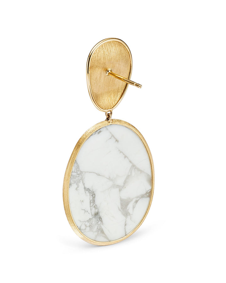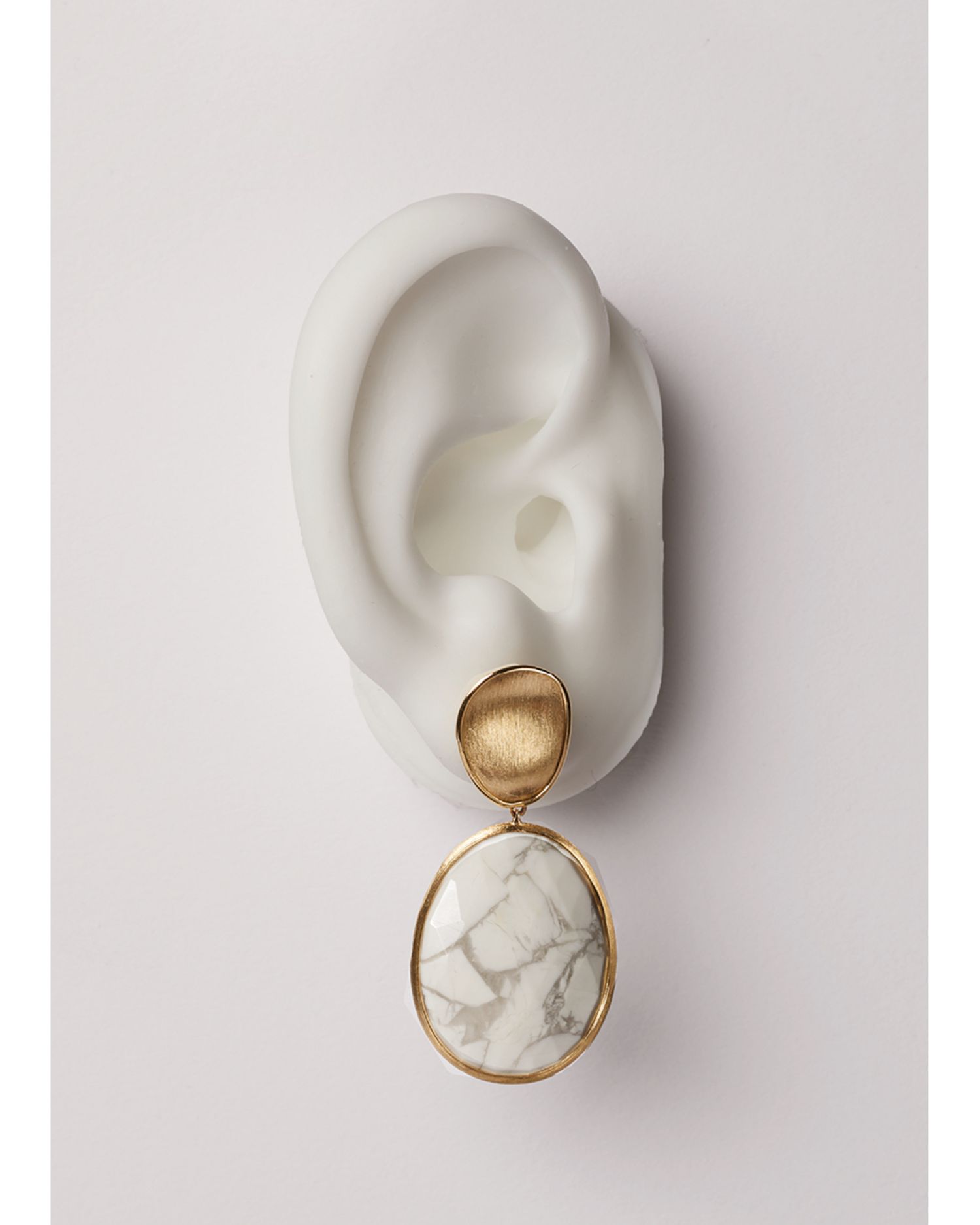 Made from 18K yellow gold with howlite stones. Dimensions: 1.72'L. Secured with post back closures. Handcrafted in Italy.