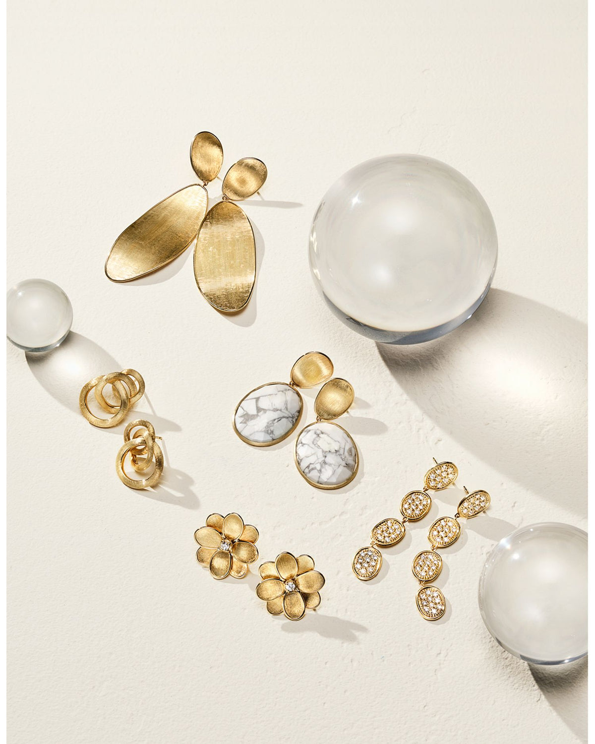 These 18K Yellow Gold Lunaria Howlite Drop Earrings by Marco Bicego are a limited-edition design celebrating Bloomingdale's 150th Anniversary. Inspired by iconic black and white tones, these earrings feature faceted howlite stones paired with hand-engraved gold petals, offering timeless elegance.