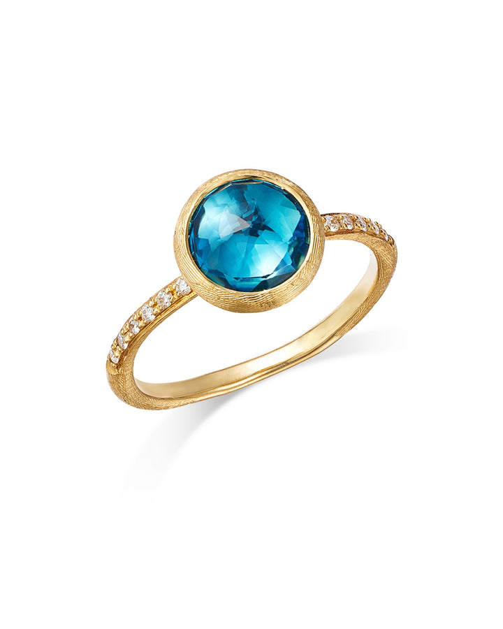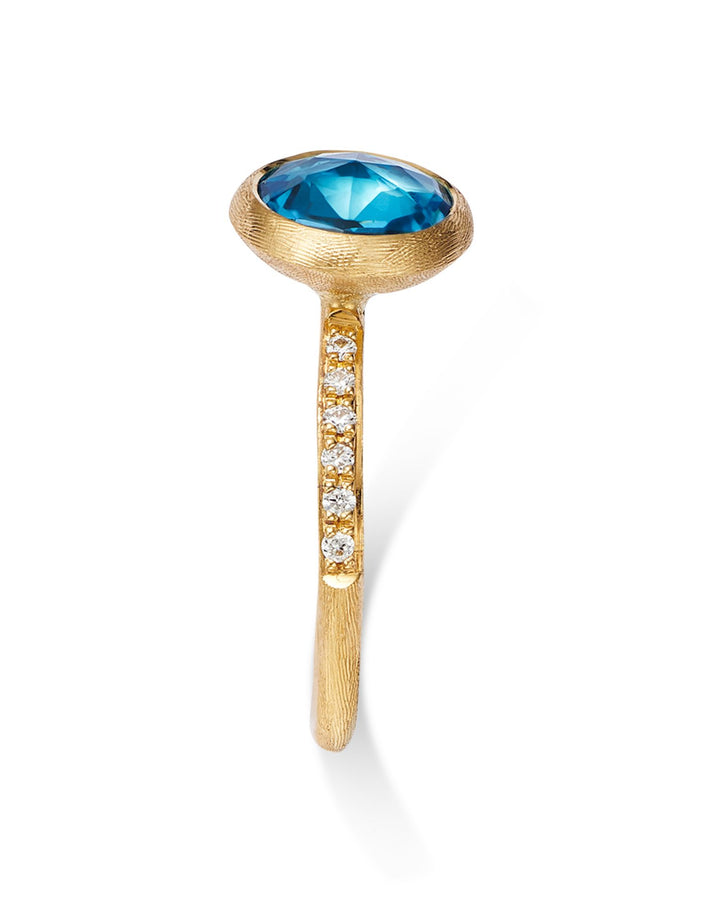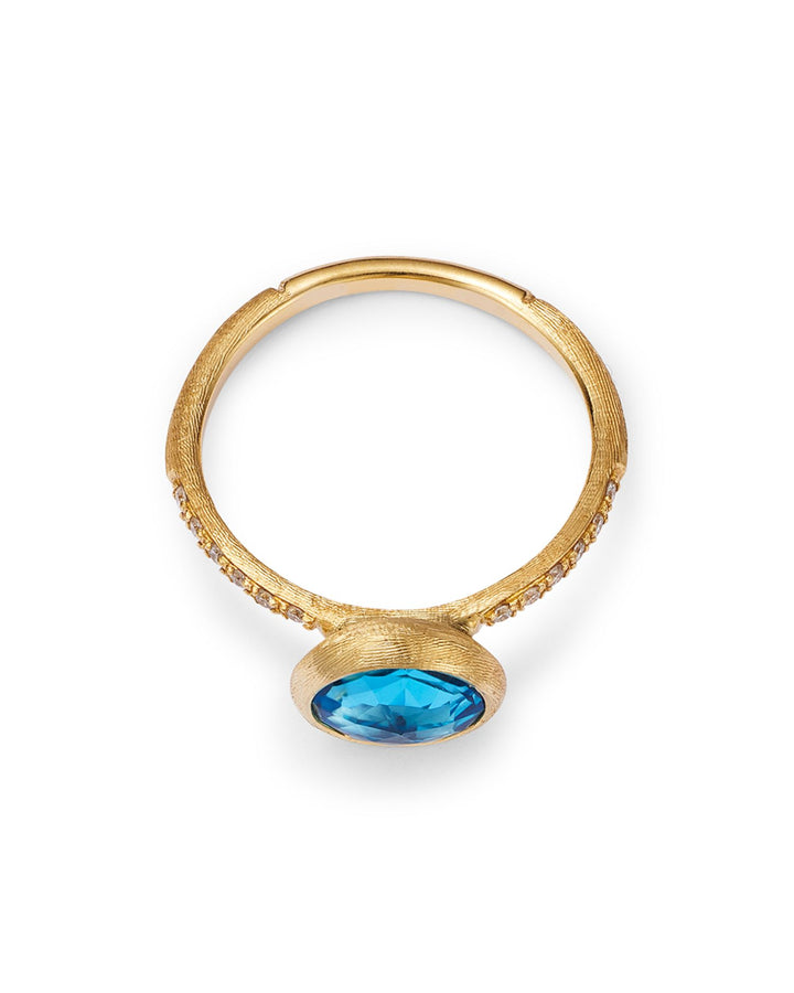 This 18K Yellow Gold, Diamond & Blue Topaz Ring by Marco Bicego is a refined design from the Jaipur collection. Featuring a vibrant blue topaz accented with diamonds, this ring captures the essence of colorful elegance and modern craftsmanship.