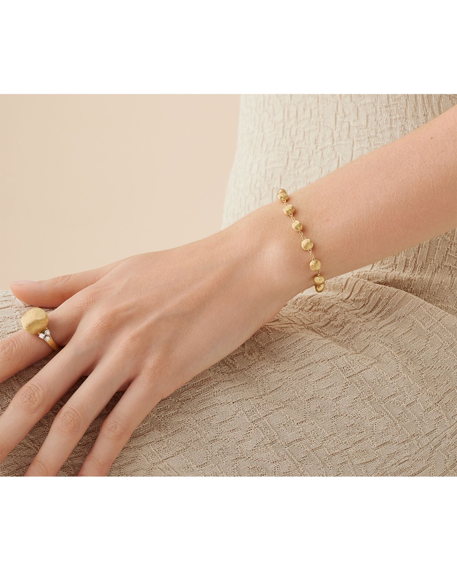 This 18K Yellow Gold Africa Textured Bead Bracelet by Marco Bicego is a statement design from the Africa collection. Featuring intricately textured gold beads, this bracelet embodies artisanal craftsmanship and a bold aesthetic.