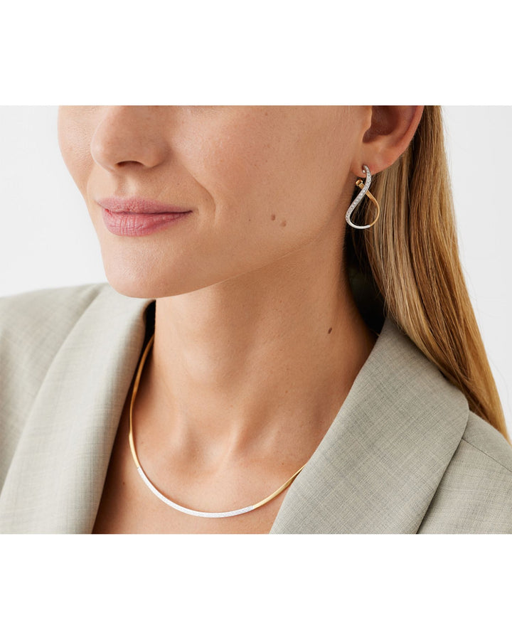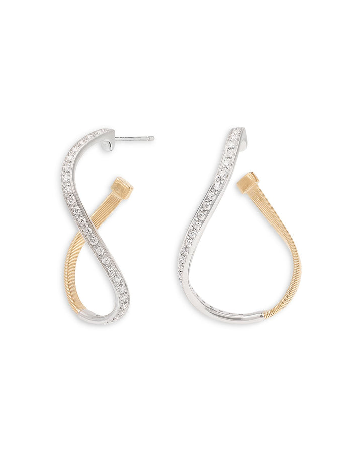 These 18K White & Yellow Gold Marrakech Diamond Small Twist Hoop Earrings by Marco Bicego are a refined design from the Marrakech collection. Featuring a two-tone twist design accented with sparkling diamonds, these earrings are the perfect blend of elegance and modernity.