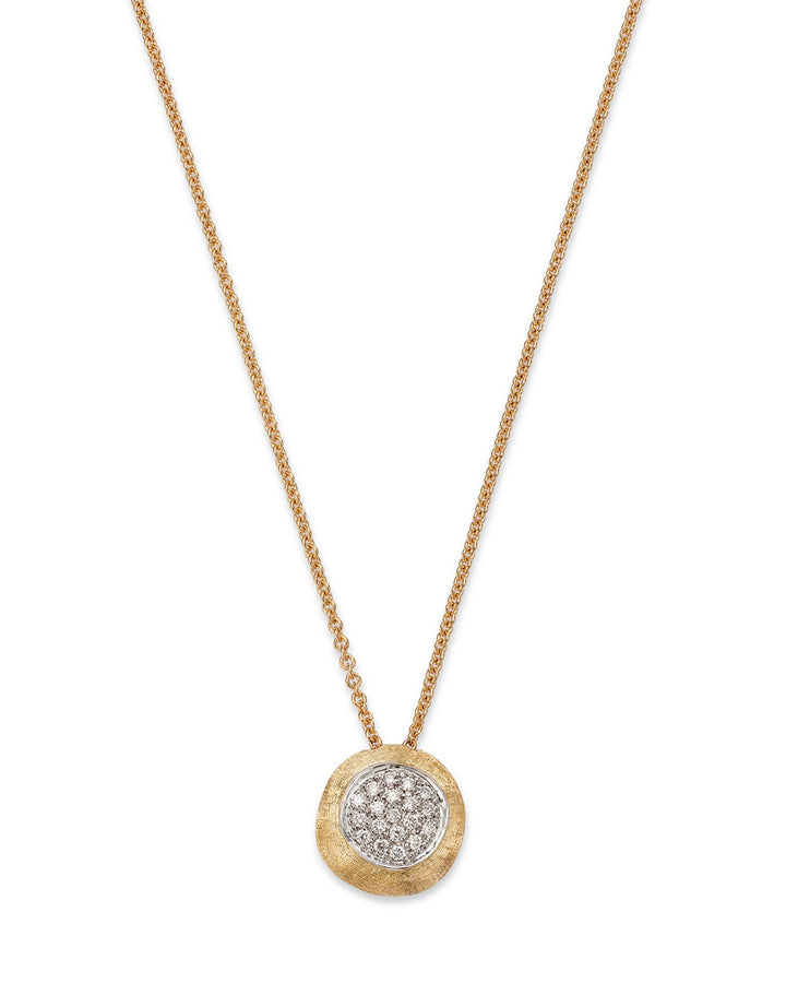 This 18K Yellow Gold Delicati Pendant Necklace with Diamonds by Marco Bicego is a dazzling design that combines hand-engraved gold with a pavé diamond pendant, offering understated luxury for any occasion.