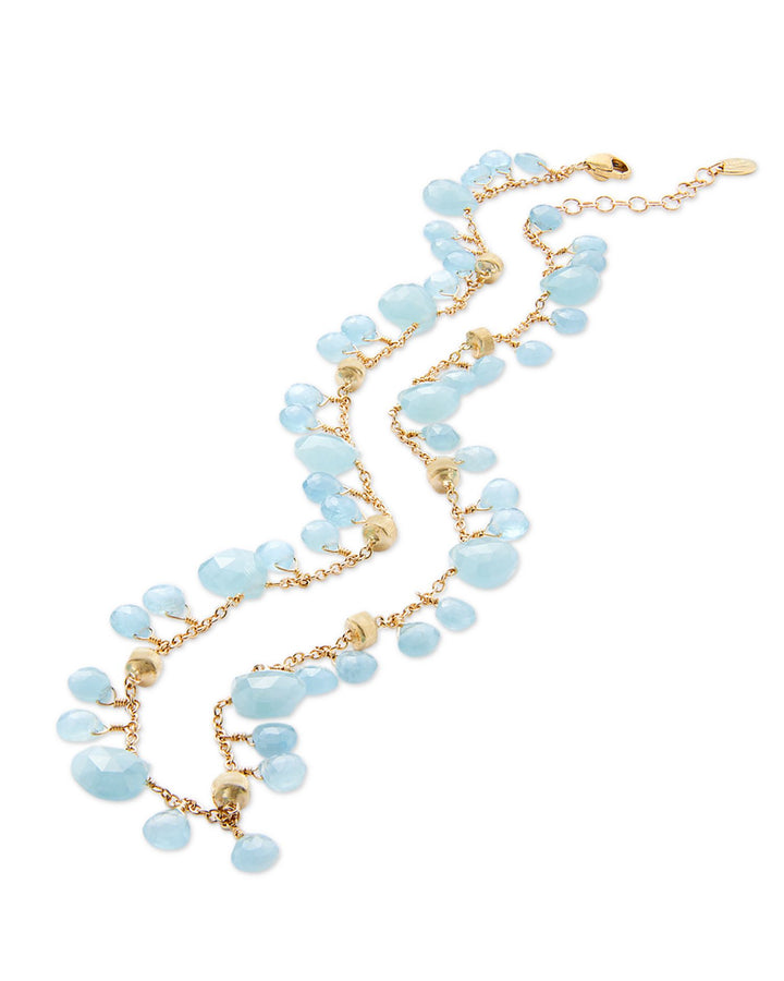 This Paradise Aquamarine Dangle Collar Necklace by Marco Bicego is an exclusive treasure that combines pale aquamarine with the warmth of 18K yellow gold. From the Paradise Aquamarine collection, this elegant collar necklace is perfect for adding a touch of sophistication and radiance to any outfit. Its refined design and luminous gemstones make it an ideal piece for special occasions or elevating everyday wear.