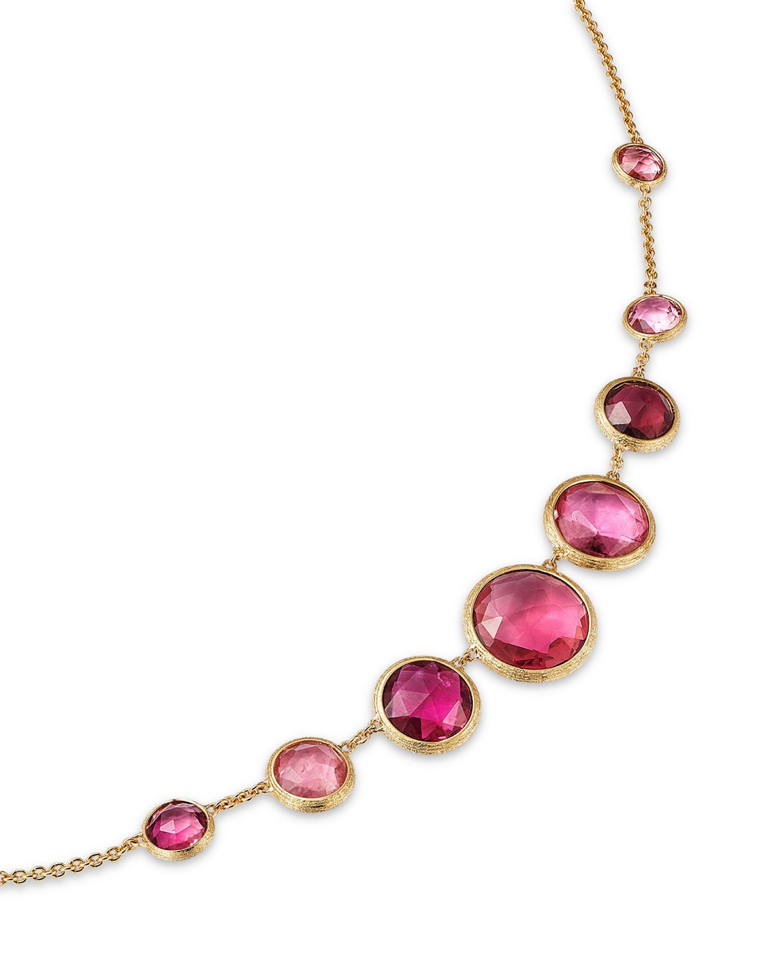 Handcrafted in 18K yellow gold, featuring bezel-set pink tourmaline gemstones. Necklace measures 16.5-18' in length with a lobster clasp closure. Made in Italy.