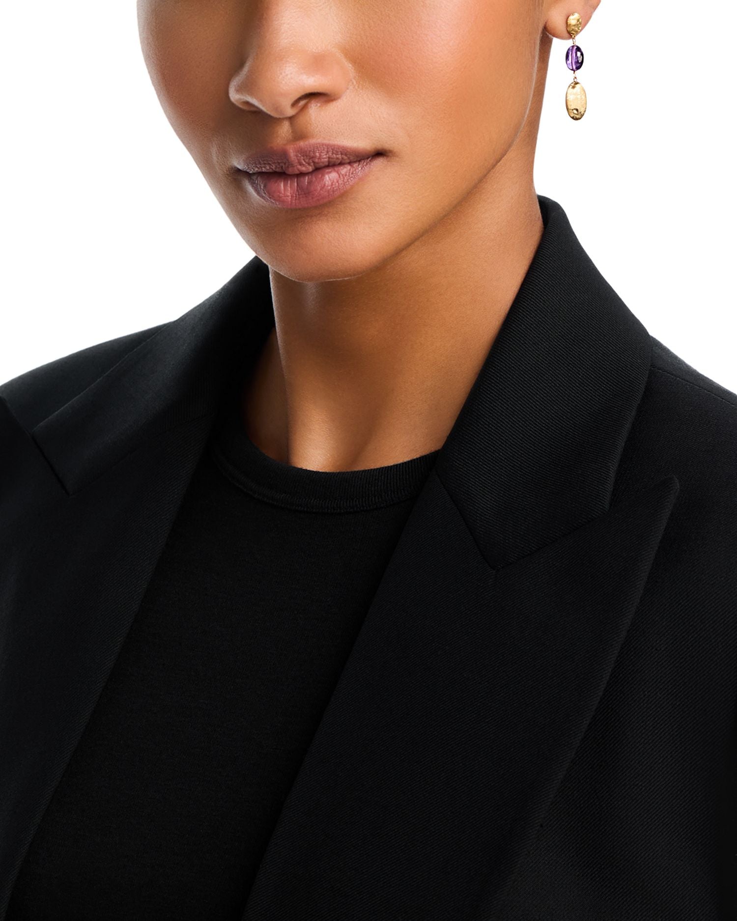 Handcrafted in 18K yellow gold, featuring bezel-set amethyst gemstones. Earrings measure 1.5' in length with post back closures. Made in Italy.