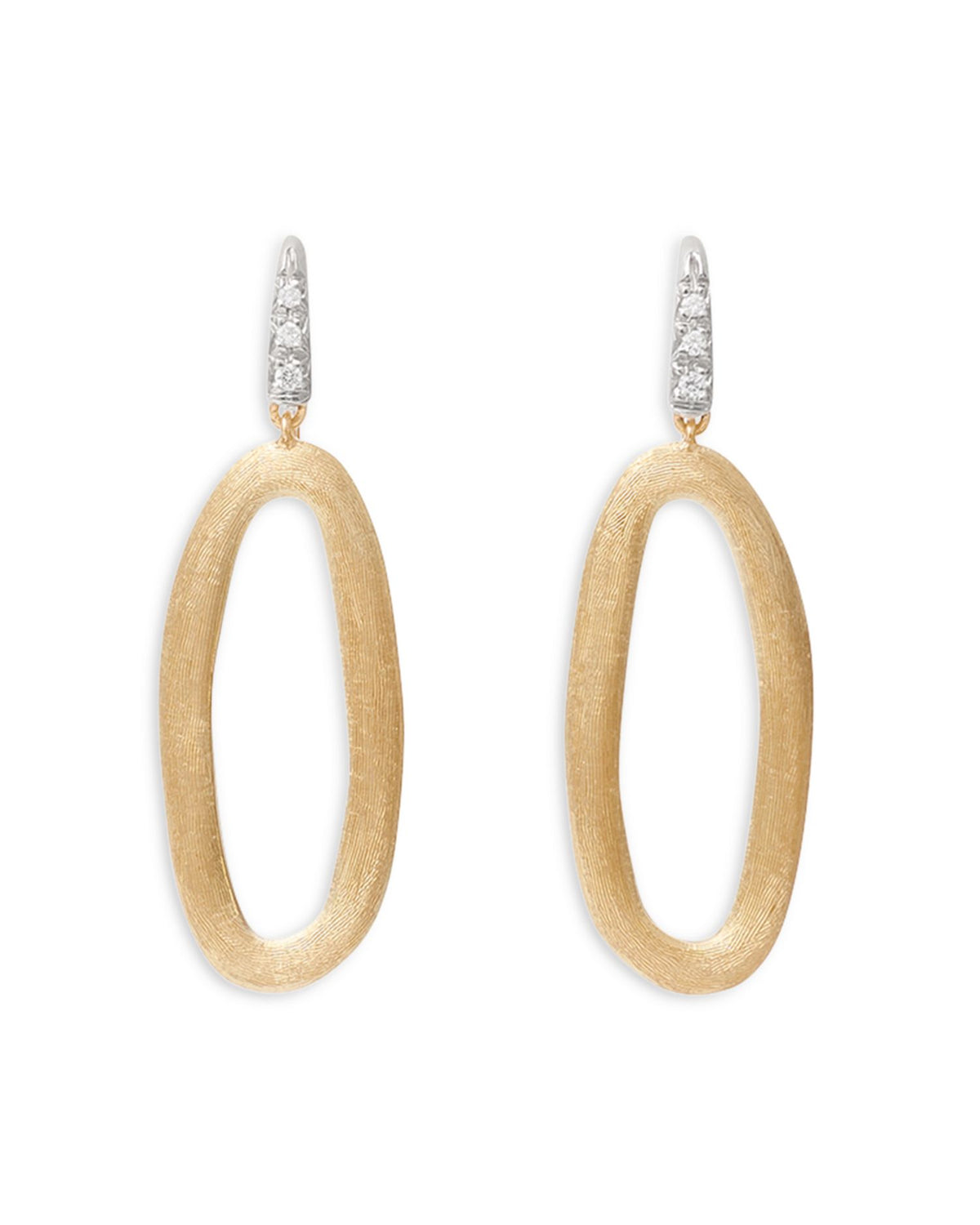 These Jaipur Link Diamond Oval Link Drop Earrings by Marco Bicego combine elegance and texture in a striking design. From the Jaipur Link collection, the textured oval links are accented with shimmering pavé diamonds, while the blend of white and yellow gold adds a modern touch. Ideal for both formal occasions and everyday sophistication.