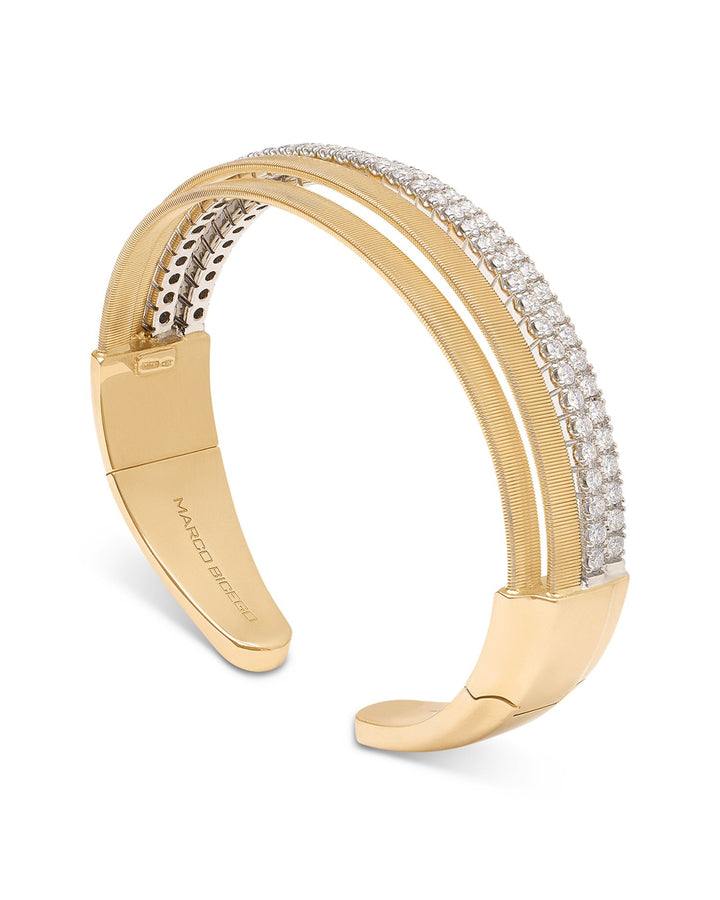 Handcrafted in 18K yellow gold with rhodium-coated white gold. Features diamonds totaling 1.85 carats (ct. t.w.) with FG color and VVS-VS clarity. Cuff diameter: 2.4'. White gold may require replating over time. Made in Italy.