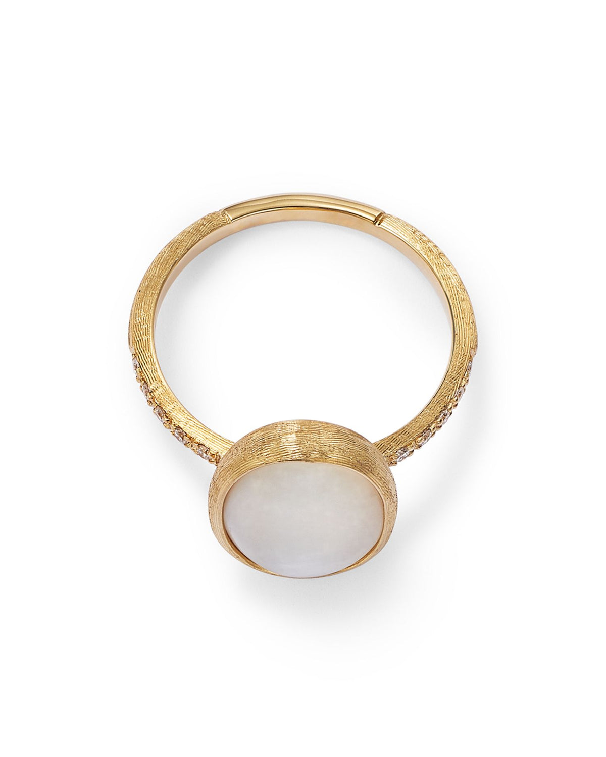 This Siviglia Mother of Pearl & Diamond Ring by Marco Bicego blends the soft glow of a cabochon mother of pearl with the brilliance of diamonds along the shank. From the Siviglia collection, this ring is a sophisticated choice for adding elegance and luxury to any look.