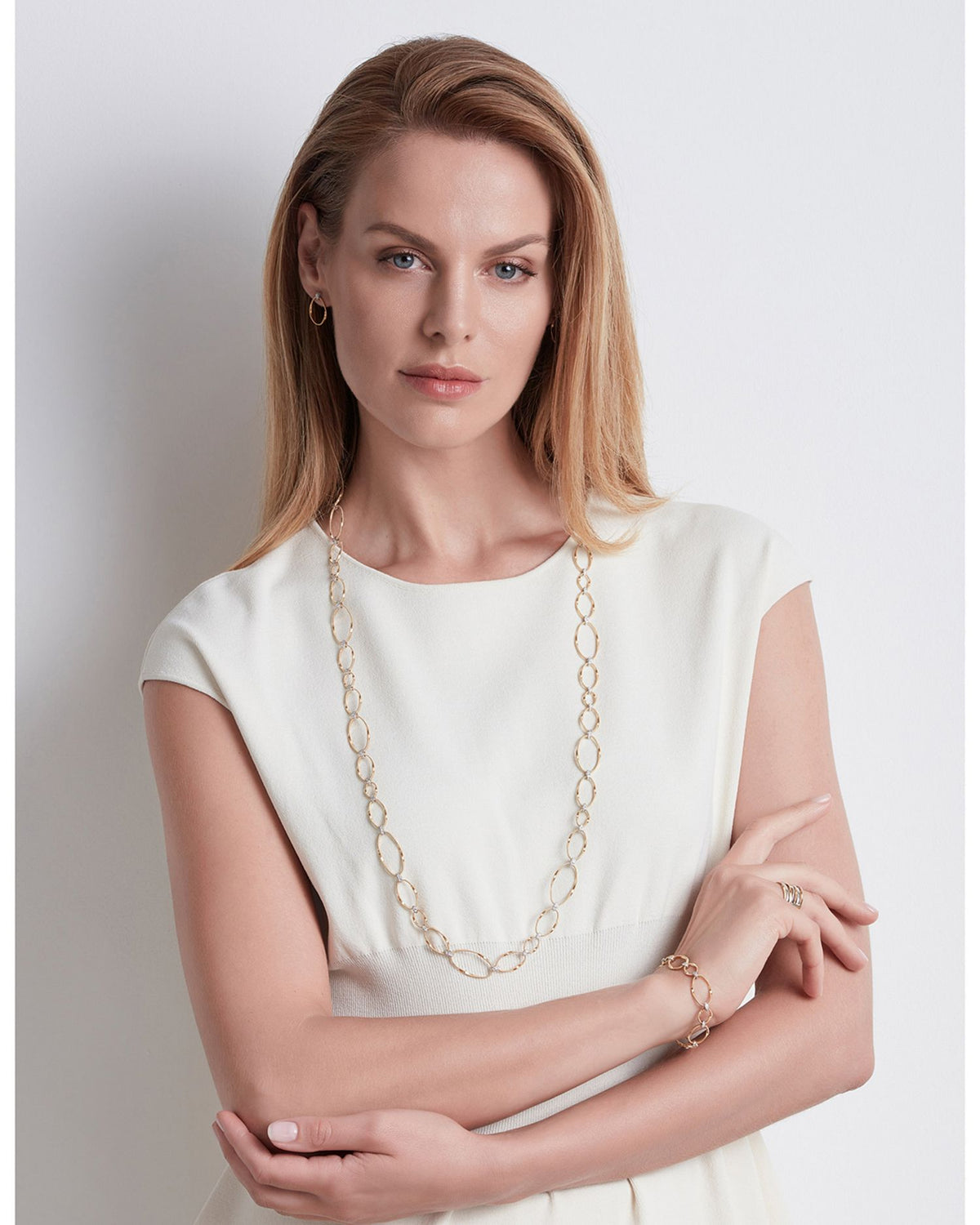 This 18K Yellow Gold Onde Diamond Station Bracelet by Marco Bicego combines twisted oval and circle coil links with sparkling diamond stations for a design that is both bold and elegant. Perfect for making a sophisticated statement, this bracelet embodies modern luxury.