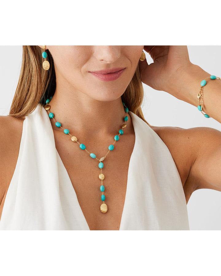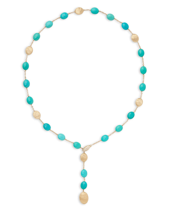 This Siviglia Turquoise & Diamond Lariat Necklace by Marco Bicego is a strikingly elegant design from the Siviglia Turquoise collection. Featuring vibrant turquoise stones and a diamond-accented lariat clasp, this necklace offers a harmonious balance of bold color and refined luxury. Perfect for making a statement with a splash of color.