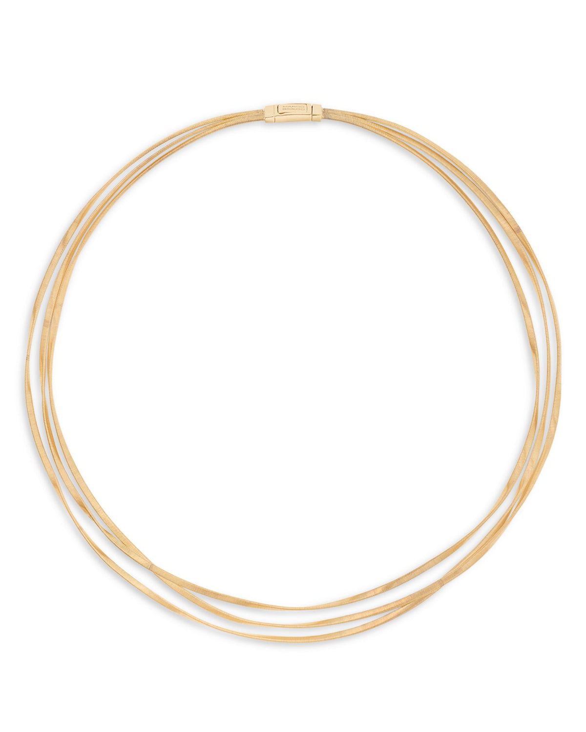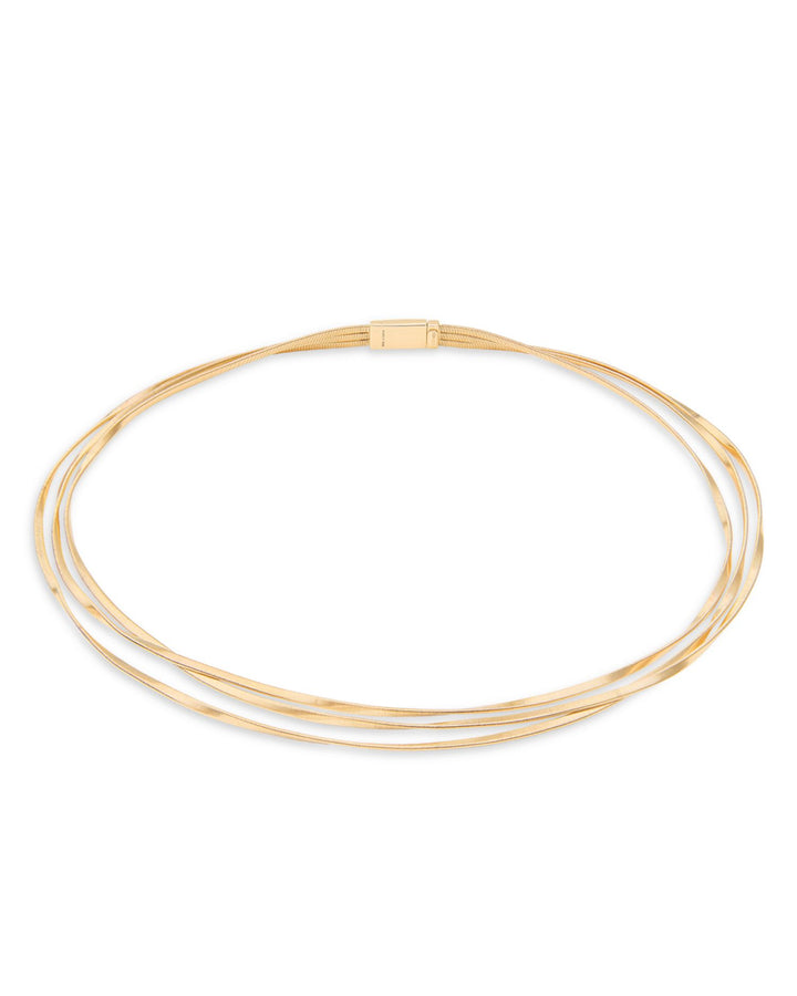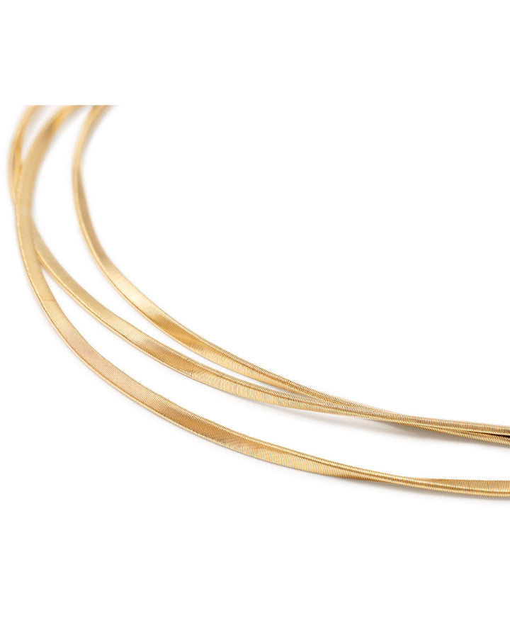 This Marrakech Three Strand Necklace by Marco Bicego brings modern elegance to the classic collar design. From the Marrakech collection, the three textured gold strands create a bold yet refined look, perfect for making a statement with effortless sophistication.