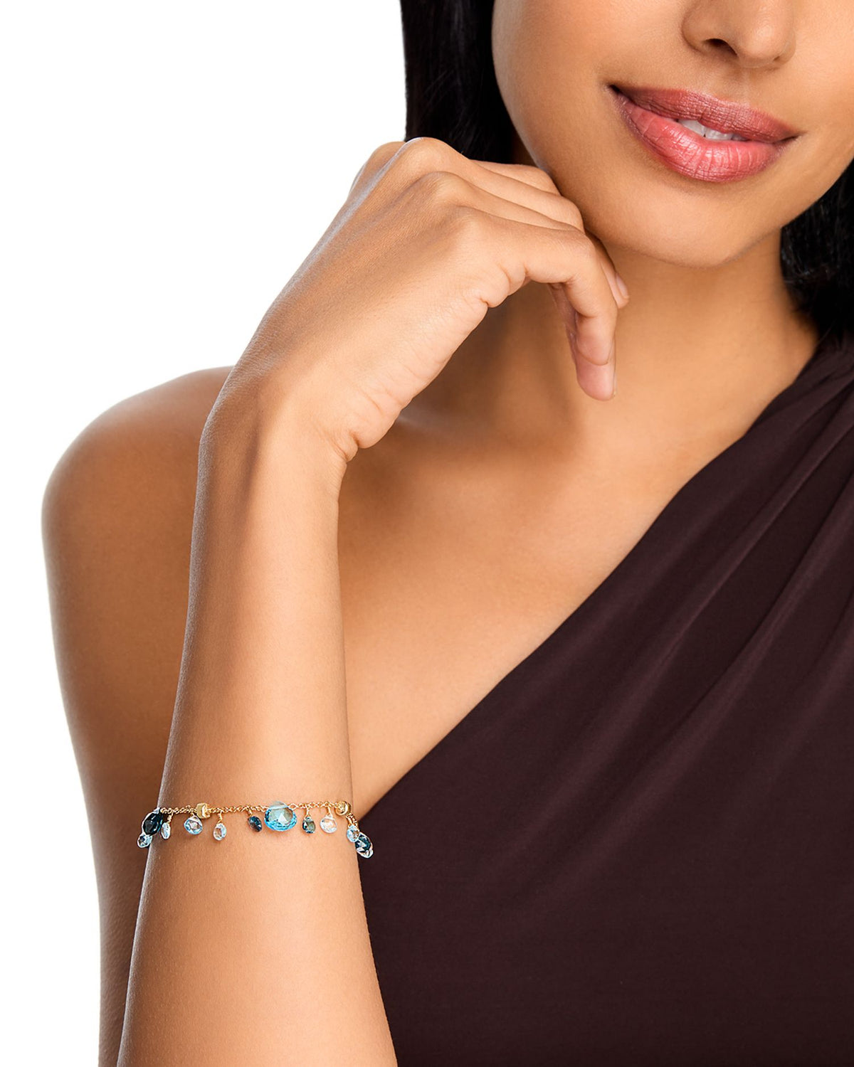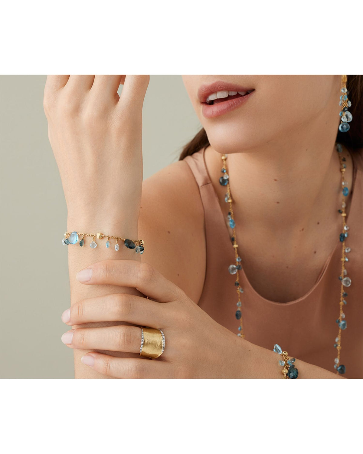 This 18K Yellow Gold Paradise Topaz Swiss Blue & London Blue Topaz Dangle Bracelet by Marco Bicego casts a mesmerizing blue silhouette with mixed-size Swiss and London blue topaz stones. Its radiant design exudes elegance and is perfect for adding a touch of color to any outfit.