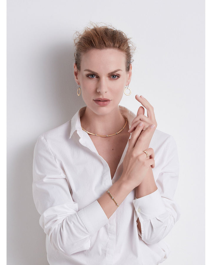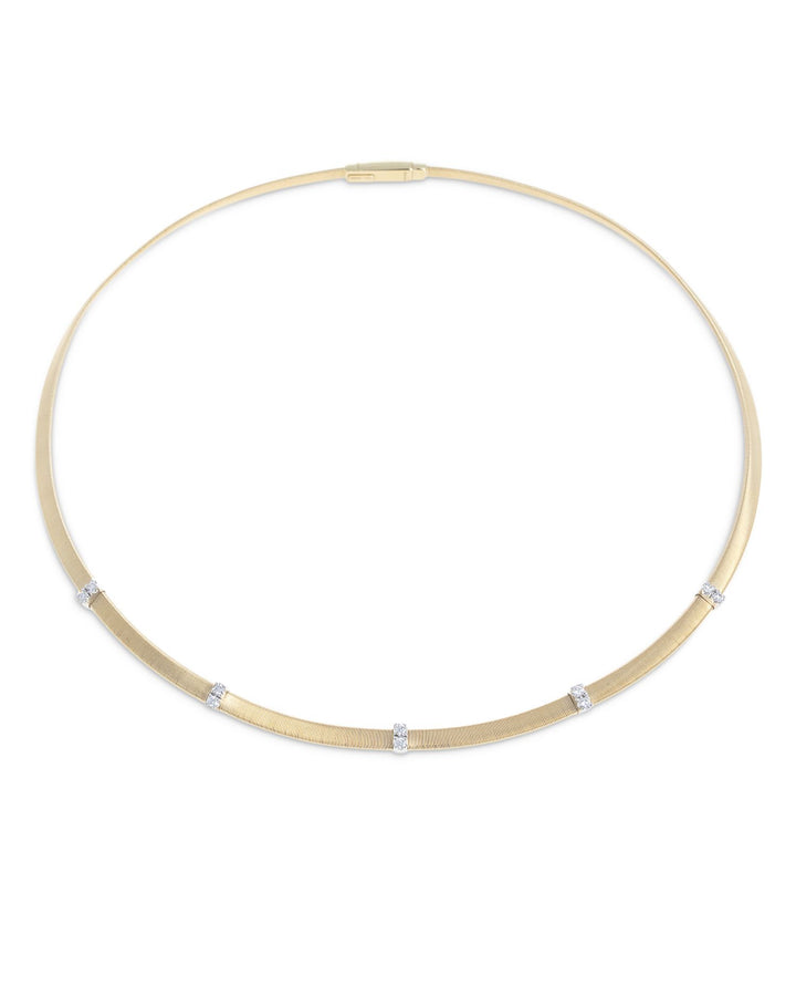 This Masai Diamond Station Collar Necklace by Marco Bicego is a modern yet timeless design. From the Masai collection, the textured yellow gold collar features five diamond stations, creating a sophisticated and luxurious piece ideal for special occasions or everyday elegance.