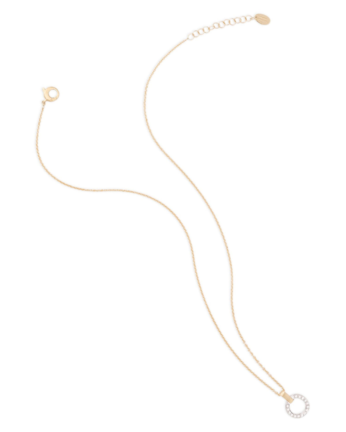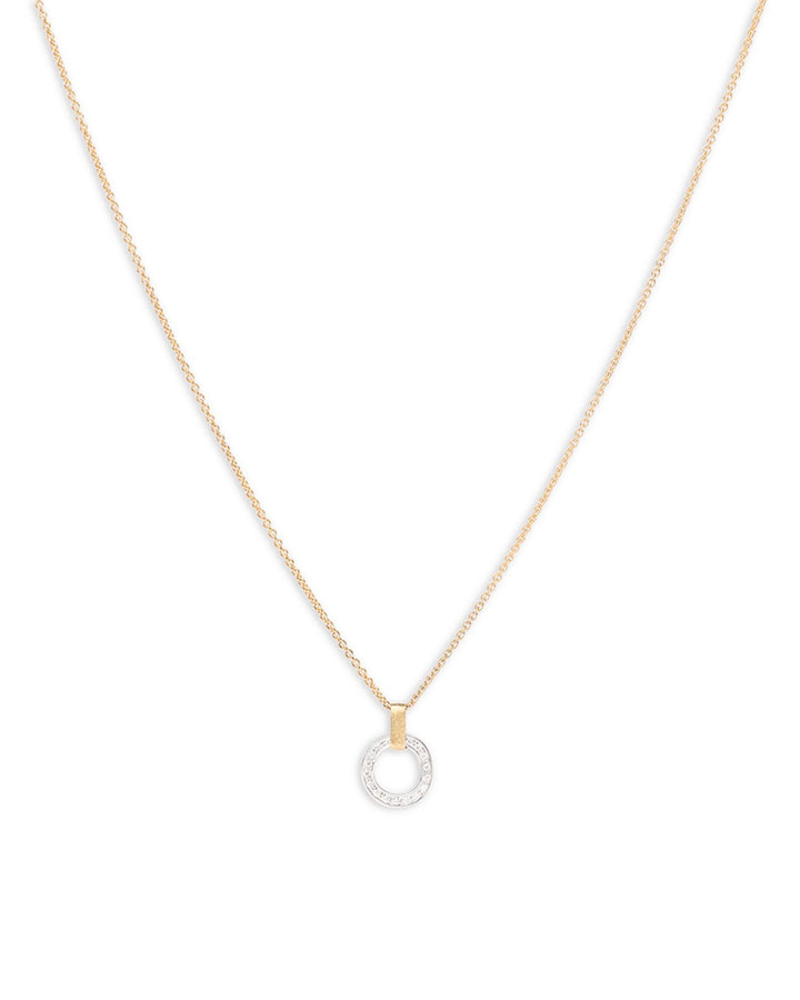 This Jaipur Link Diamond Flat Circle Pendant Necklace by Marco Bicego is a stunning two-tone design from the Jaipur Link collection. The textured gold circle pendant is accented with brilliant diamonds, offering an elevated elegance that is perfect for both layering and standalone wear. The versatile design makes it an ideal choice for adding sophistication to any outfit.