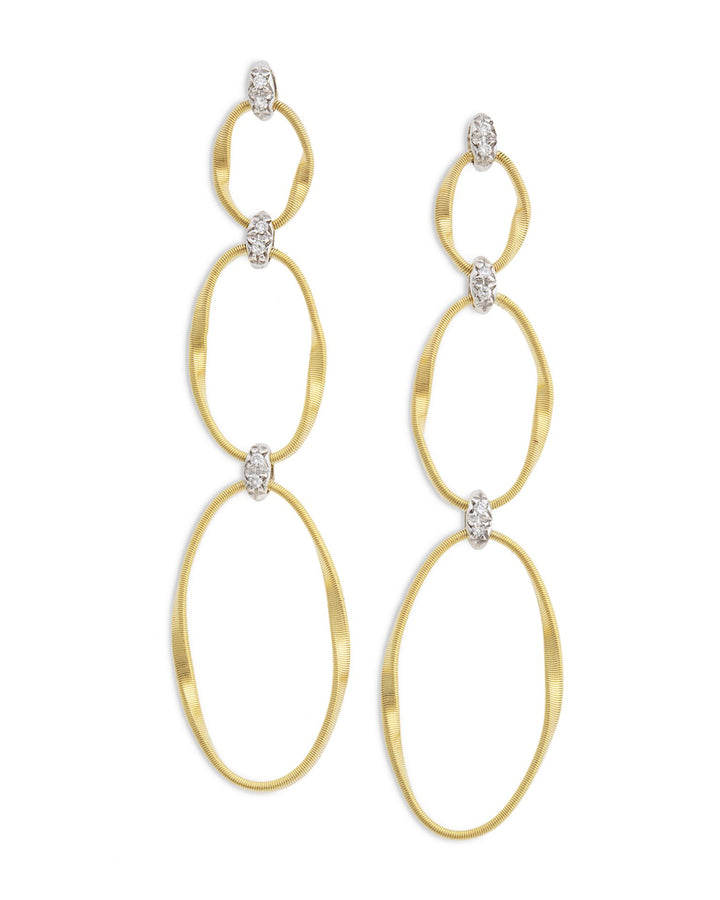 These Onde Triple Link Post Earrings by Marco Bicego are a bold and contemporary design. A trio of twisted oval coil links in yellow gold is suspended from a diamond-encrusted white gold ear post, creating a dramatic and elegant statement piece. Perfect for occasions that call for standout jewelry.