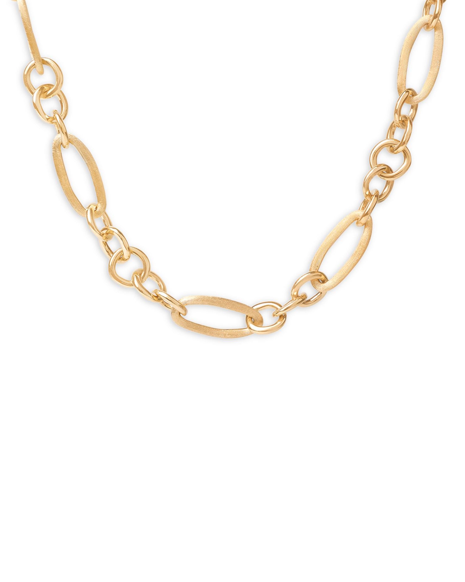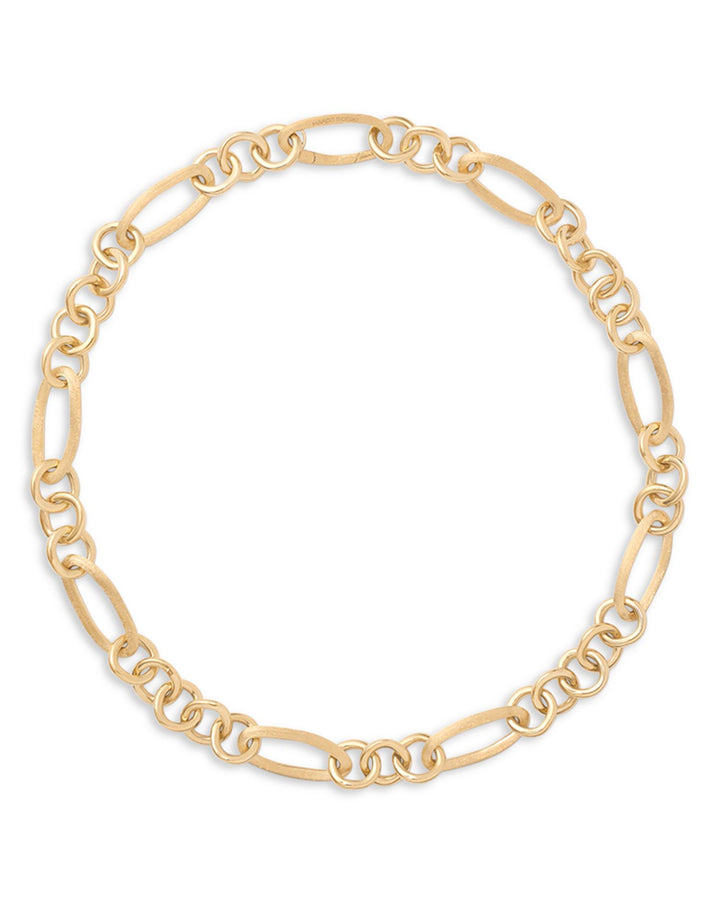 This Jaipur Link Polished Mixed Link Statement Necklace by Marco Bicego is a chic and luxurious accessory. From the Jaipur Link collection, the mixed polished links in 18K yellow gold create a bold and elegant design, perfect for making a statement with any outfit.