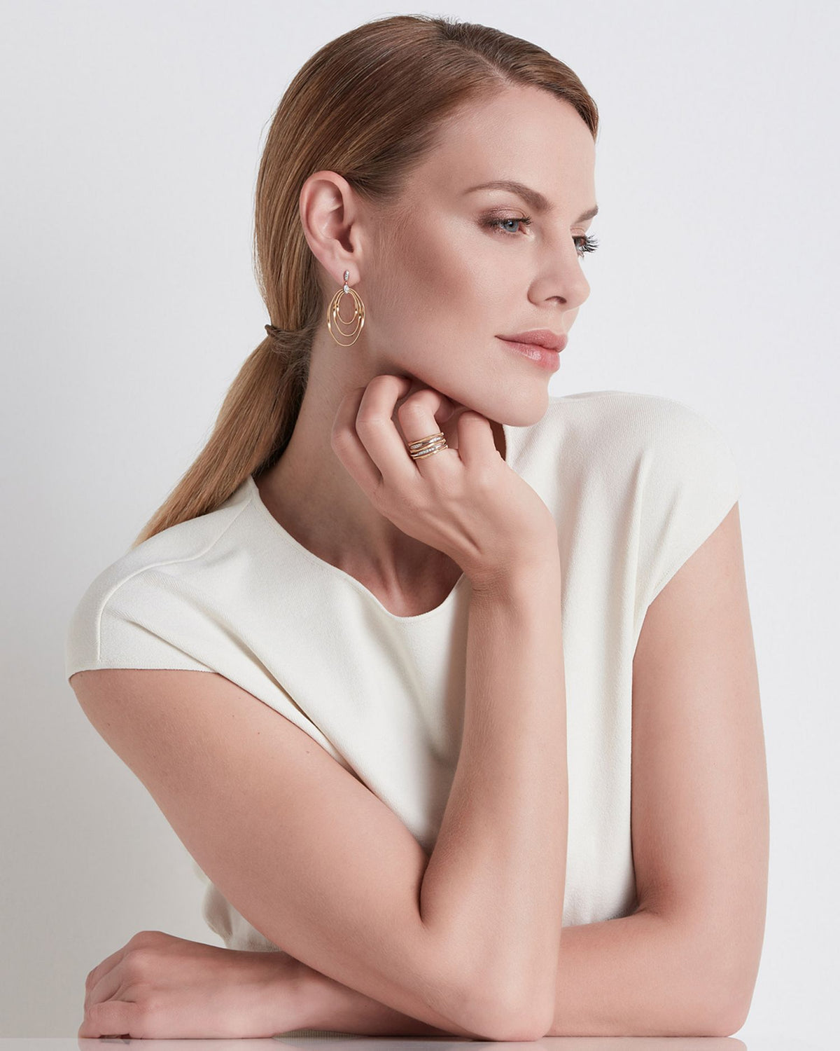 These Onde Triple Loop Post Earrings by Marco Bicego offer a dynamic and elegant design. A trio of twisted oval coil rings in yellow gold is suspended from twin diamond-encrusted white gold posts, creating a contemporary yet sophisticated look. Ideal for adding subtle sparkle and movement to any ensemble.