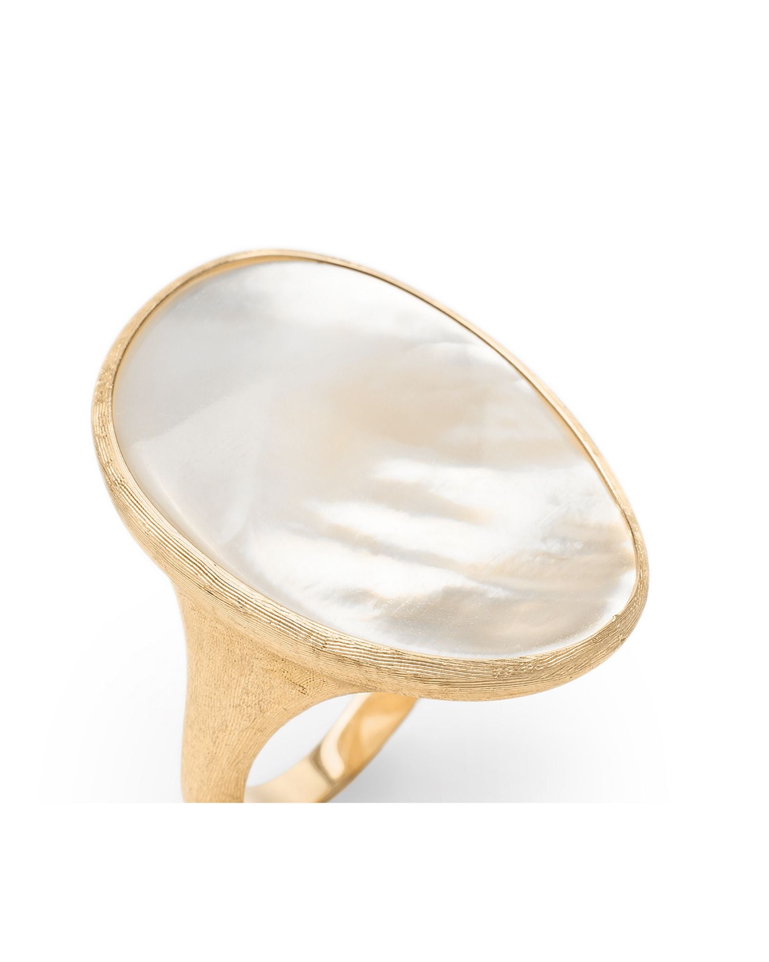 This Lunaria Mother of Pearl Ring by Marco Bicego is a striking piece from the Lunaria collection. Featuring a large, organically shaped mother-of-pearl centerpiece framed in textured 18K yellow gold, this ring embodies natural elegance and timeless beauty. Perfect for making a bold and graceful statement.