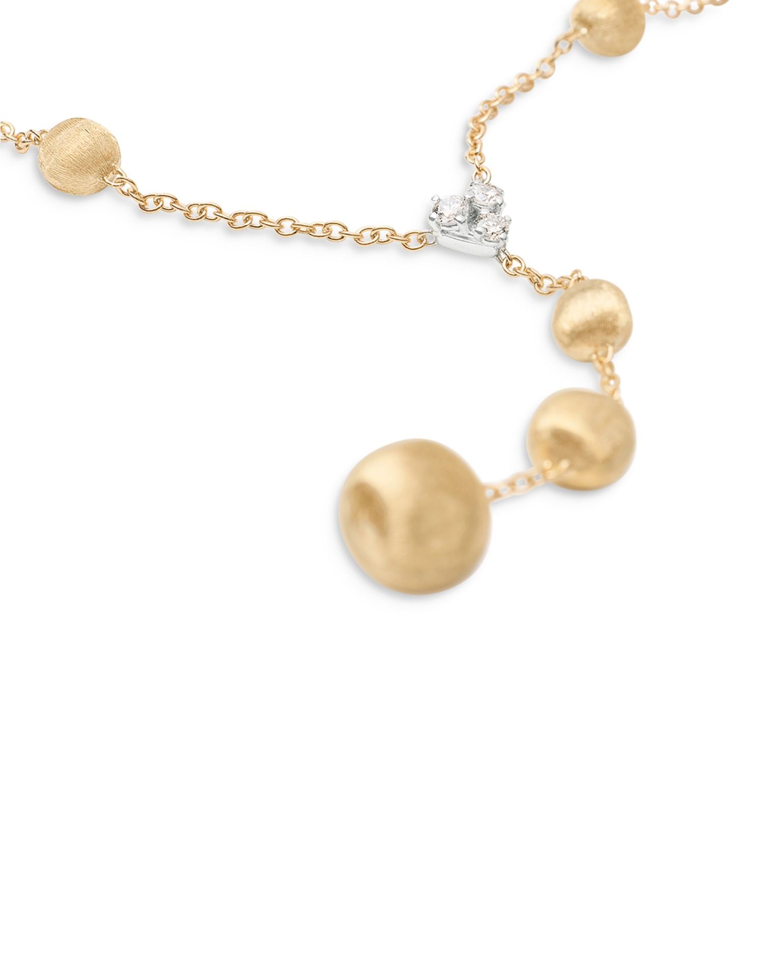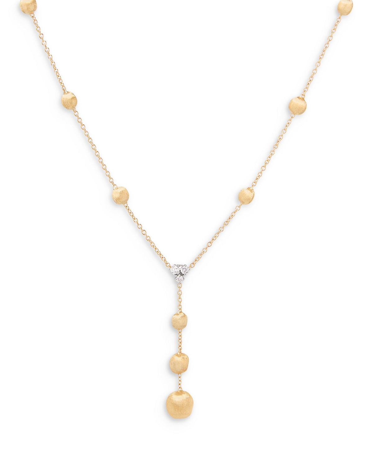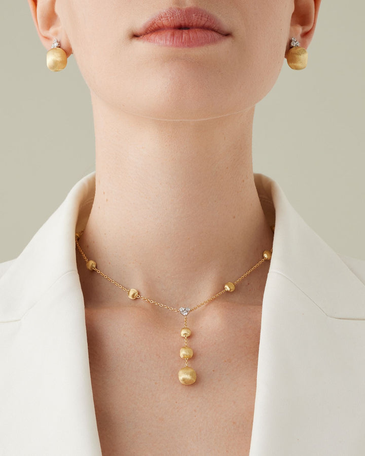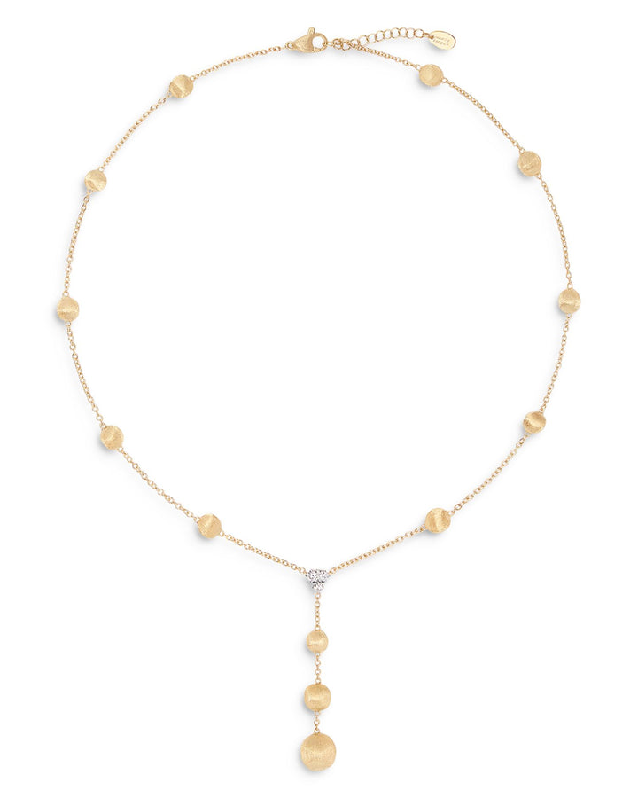 This Africa Diamond Cluster & Textured Bead Lariat Necklace by Marco Bicego is an exquisite design from the Africa collection. The textured yellow gold beads are elegantly complemented by three sparkling diamond clusters in white gold, creating a luxurious lariat necklace that exudes contemporary sophistication. Perfect for elevating any ensemble.