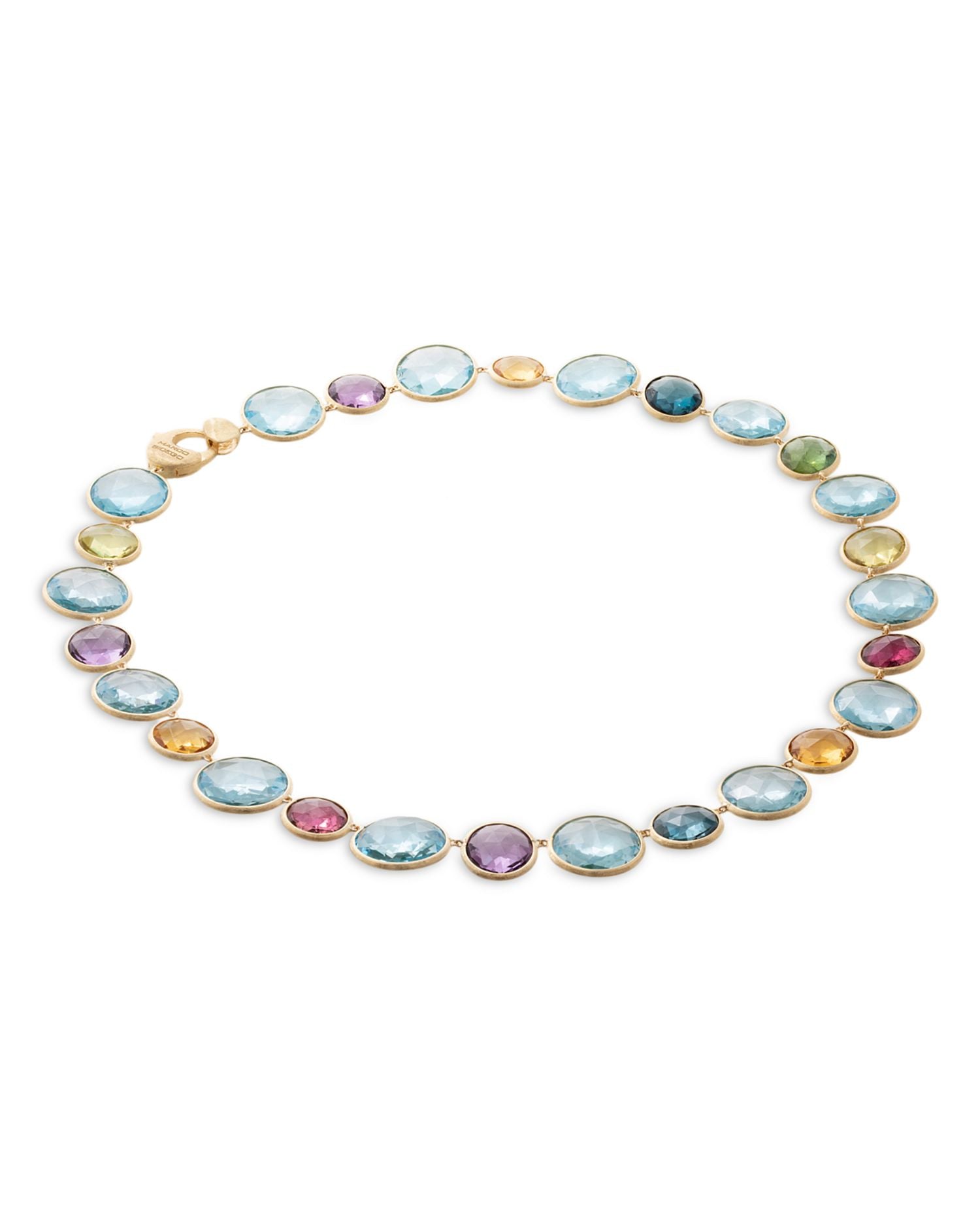 Handcrafted in 18K yellow gold, featuring a mix of topaz, amethyst, tourmaline, garnet, citrine, or peridot. Necklace measures 18.5' in length with a lobster clasp closure. Color and sequence may vary from piece to piece. Made in Italy.