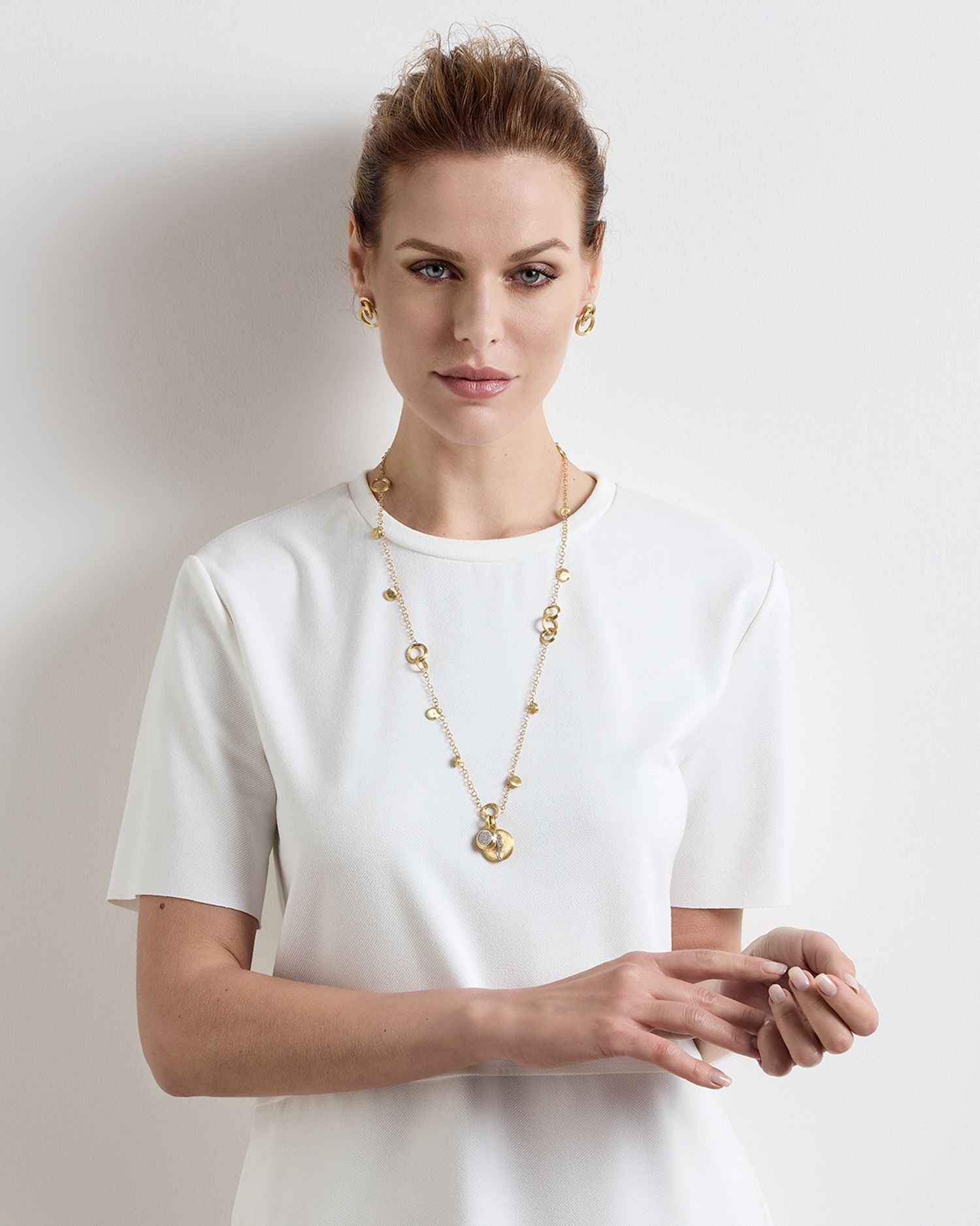 This Jaipur Long Charm Statement Necklace by Marco Bicego offers a refined and elegant design from the Jaipur collection. The long chain is adorned with delicate links and tiny gold discs, creating a graceful and versatile piece that transitions effortlessly from day to night.