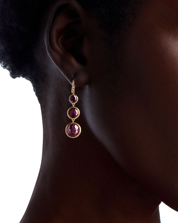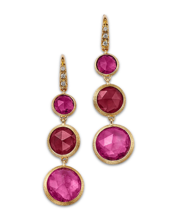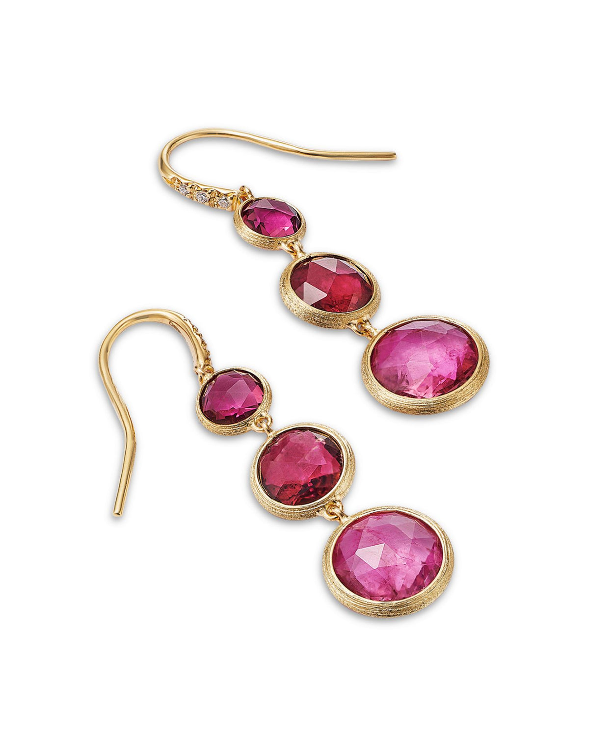 These Jaipur Color Pink Tourmaline & Diamond Triple Drop Earrings by Marco Bicego are an exclusive design that radiates bold elegance. From the Jaipur Color collection, the bezel-set pink tourmalines cascade in a triple-drop design, accented by sparkling diamonds. Perfect for adding sophistication to any occasion.