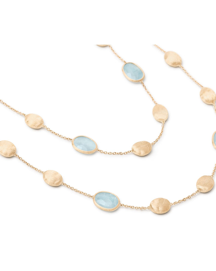 This Siviglia Aquamarine Long Statement Necklace by Marco Bicego is a stunning piece from the Siviglia Aquamarine collection. The long chain alternates between beautiful oval aquamarines and textured gold beads, creating a luxurious design perfect for layering or wearing alone as a statement accessory.