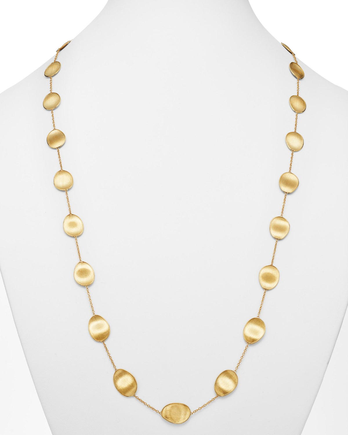 This Lunaria Station Necklace by Marco Bicego is a timeless and versatile design. The 36-inch chain features delicate gold stations with a textured finish, making it perfect for layering or wearing alone as a sophisticated statement piece.
