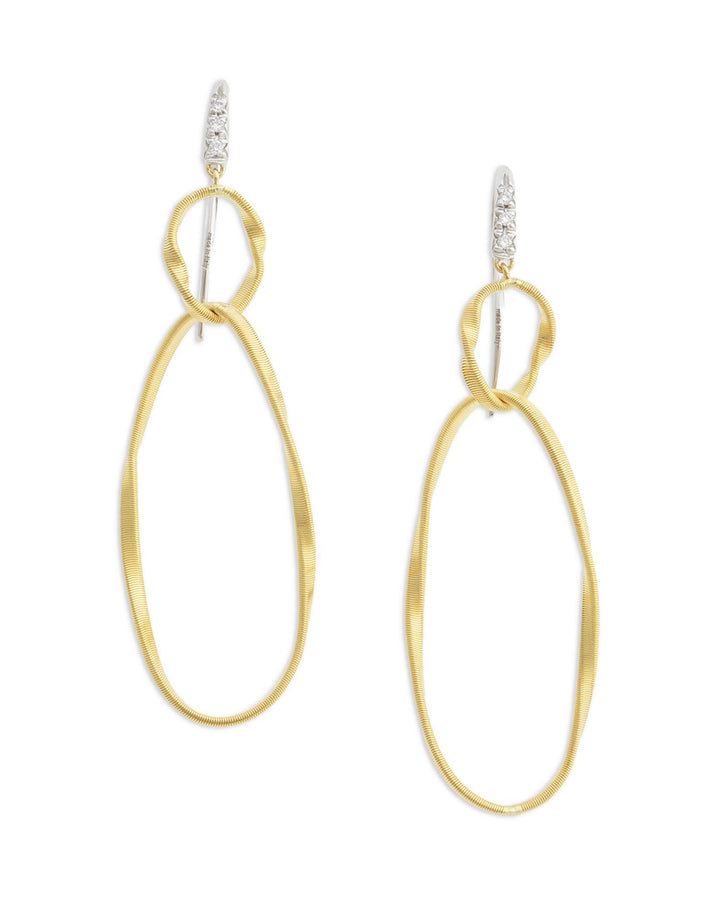 These Onde Double Link Hook Earrings by Marco Bicego are a bold yet elegant design. Featuring twisted double oval coil links punctuated by sparkling diamonds, these earrings make a sophisticated statement for day or evening wear.