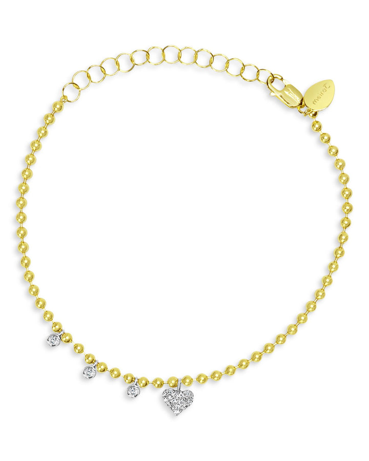 This Diamond Heart Bead Chain Bracelet by Meira T is a delicate and romantic piece. Featuring a heart-shaped diamond accent and a bead chain design, this 14K yellow gold bracelet is perfect for layering or wearing alone for a subtle touch of luxury.