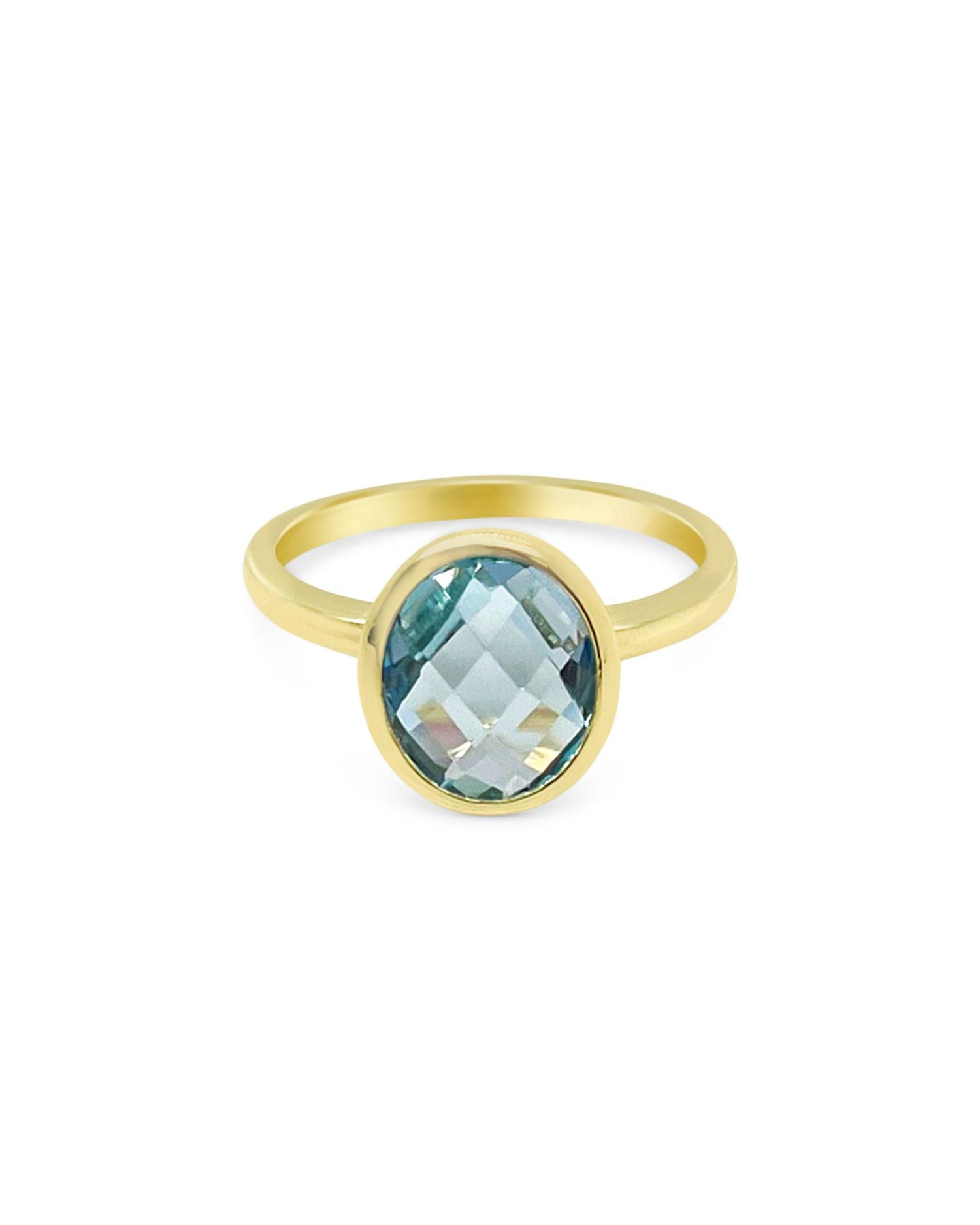 This Blue Topaz Oval Ring by Meira T features a stunning oval-shaped blue topaz set in 14K yellow gold. The bold gemstone makes a striking statement on its own, adding a pop of color and sophistication to any ensemble.